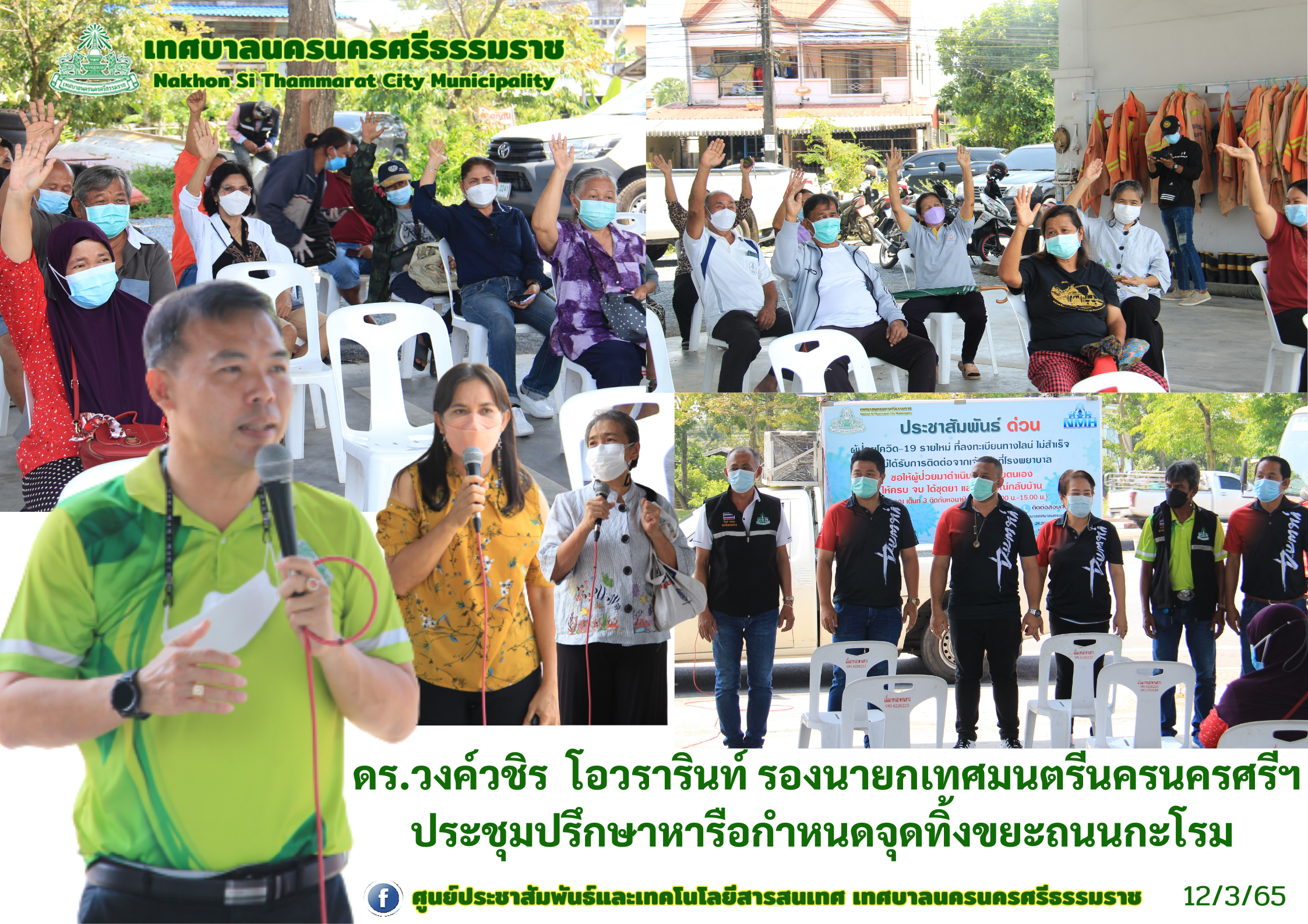 | ดร.วงค์วชิร โอวรารินท์ รองนายกเทศมนตรีนครนครศรีธรรมราช ประชุมปรึกษาหารือกำหนดจุดทิ้งขยะ และ การคัดแยกขยะ ให้มีระบบการจัดการขยะที่ดีควบคุมปริมาณมูลฝอยและเพิ่มประสิทธิภาพในการจัดการขยะ ให้กับประชาชน ผู้ประกอบการ และเจ้าของร้านค้า บริเวณ ถนนกะโรม (ตั้งแต่หน้านครอาชีวะ- หลักกิโล 5 ) |