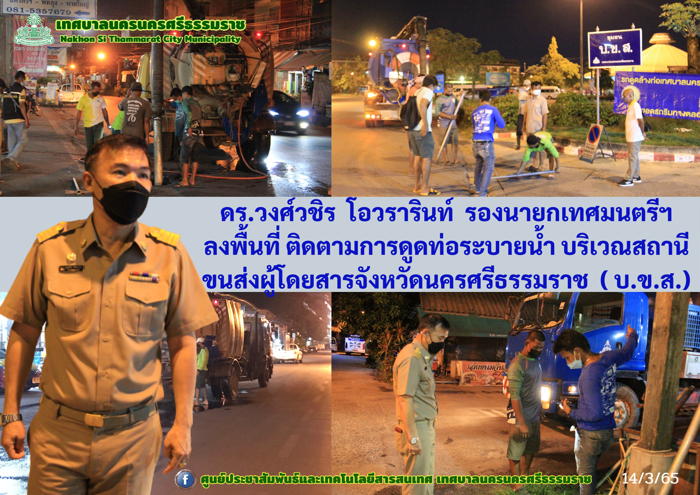 | วันจันทร์ ที่ 14 มีนาคม 2565 เวลา 18.30 น. ดร.วงศ์วชิร โอวรารินท์ รองนายกเทศมนตรีนครนครศรีธรรมราช นำสมาชิกสภาเทศบาลนครนครศรีธรรมราช เขต 4 เจ้าหน้าที่กองสาธารณสุขและสิ่งแวดล้อม เทศบาลนครนครศรีธรรมราช ลงพื้นที่ ติดตามการดูดท่อระบายน้ำ บริเวณสถานีขนส่งผู้โดยสารจังหวัดนครศรีธรรมราช ( บ.ข.ส.) ตลอดแนวถนนเพื่อดูดสิ่งปฎิกูล หิน ดิน ทราย เศษขยะ พลาสติก ภายในท่อระบายน้ำ เพื่อป้องกันการอุดตันทางเดินน้ำ พร้อมระบายน้ำได้ดีตลอดเวลา
