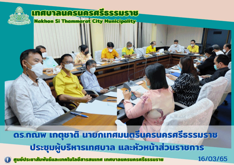 | วันพุธที่ 16 มีนาคม พ.ศ. 2565 เวลา 10.00. น. ณ ห้องประชุมเทศบาลนครนครศรีธรรมราช ชั้น2 ดร.กณพ เกตุชาติ นายกเทศมนตรีนครนครศรีธรรมราช เป็นประธานการประชุมผู้บริหารเทศบาล และหัวหน้าส่วนราชการ ครั้งที่ 8/2565 เพื่อติดตามผลการปฎิบัติราชการดังนี้