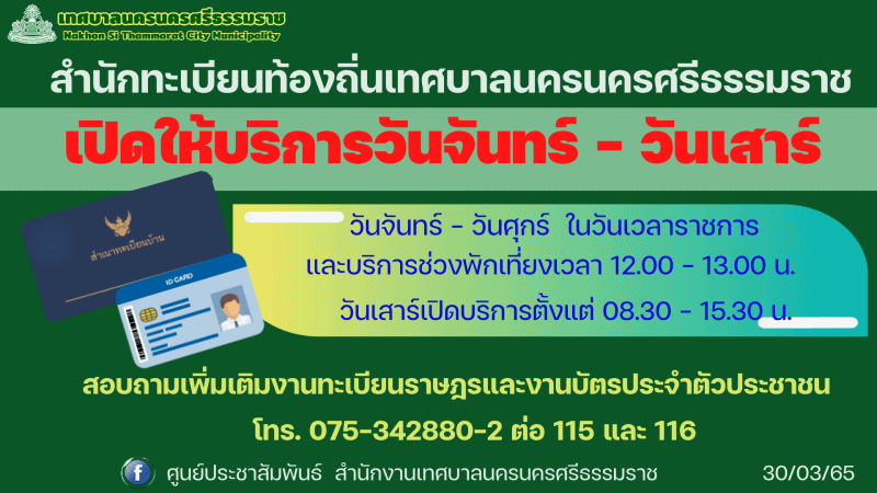 | เทศบาลนครนครศรีธรรมราช โดยงานทะเบียนราษฎรและงานบัตรประจำตัวประชาชนเปิดให้บริการวันจันทร์ - วันเสาร์ |