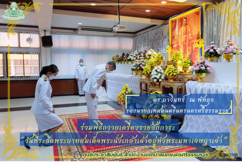 | ดร.ภาวินทร์ ณ พัทลุง รองนายกเทศมนตรีนครนครศรีธรรมราช ร่วมพิธีถวายเครื่องราชสักการะเนื่องใน “วันที่ระลึกพระบาทสมเด็จพระนั่งเกล้าเจ้าอยู่หัวพระมหาเจษฎาราชเจ้า” และ วันข้าราชการพลเรือน ประจำปี พ.ศ.2565 |
