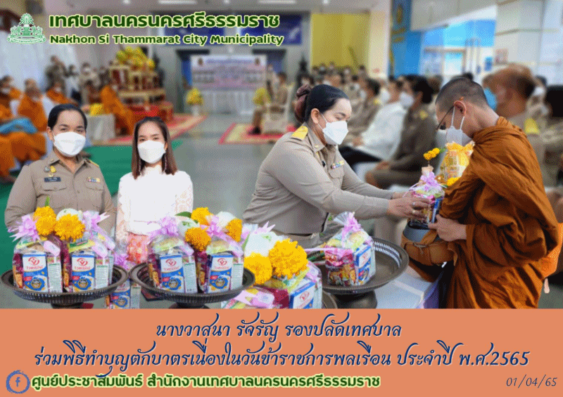 | วันศุกร์ ที่1 เมษายน 2565 เวลา 06.45 น. ณ บริเวณด้านหน้าศาลากลางจังหวัดนครศรีธรรมราช (หลังเก่า) นางวาสนา รัจรัญ รองปลัดเทศบาล ร่วมพิธีทำบุญตักบาตร ข้าวสาร อาหารแห้ง เนื่องในวันข้าราชการพลเรือน ประจำปี พ.ศ.2565 แด่พระสงฆ์จำนวน 27 รูป คณะรัฐมนตรีได้มีมติกำหนดให้ วันที่ 1 เมษายน ของทุกปี เป็นวันข้าราชการพลเรือน เพื่อให้ข้าราชการได้ตระหนักถึงเกียรติ หน้าที่ สามัคคี ซื่อสัตย์ ซึ่งเป็นคุณสมบัติของข้าราชการอันจะเปลี่ยนภาพพจน์ ทัศนคติของประชาชนที่มีต่อข้าราชการให้เป็นไปในทางที่ดีขึ้น เป็นวันที่มีความหมายอยู่ในความทรงจำ และเป็นวันที่ยอมรับของข้าราชการ และประชาชนโดยทั่วไป ………………. ภาพ//ข่าว//จันทร์จิรา ตรวจทาน//อารีรัตน์ |