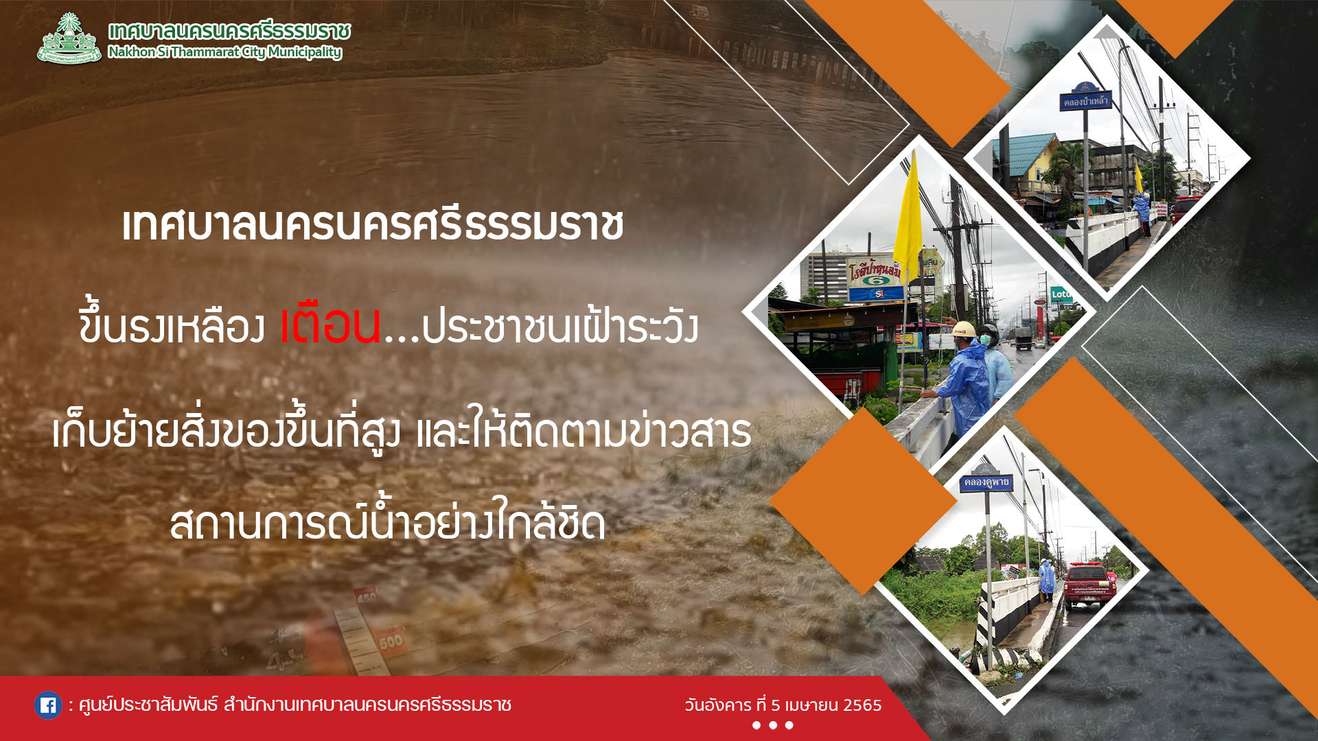 | เทศบาลนครนครศรีธรรมราช ภายใต้การนำของ ดร.กณพ เกตุชาติ นายกเทศมนตรีนครนครศรีธรรมราช ได้ดำเนินการติดตั้งป้ายพร้อมปักธงสัญลักษณ์แจ้งเตือนภัย ณ สะพานข้ามคลอง ที่ผ่านเขตเทศบาล เพื่อให้ประชาชนได้สังเกต และเตรียมพร้อมรับสถานการณ์น้ำท่วมและน้ำล้นตลิ่ง ซึ่งในขณะนี้ เกิดฝนตกหนักในพื้นที่และมีปริมาณน้ำสะสมในคลองต่างๆ เพิ่มขึ้นอย่างต่อเนื่อง จึงได้ใช้สัญลักษณ์ธงสีเหลือง ซึ่งหมายถึง ระดับน้ำต่ำกว่าตลิ่ง น้อยกว่า 1.50 เมตร ให้ติดตามข่าวสารอย่างใกล้ชิด และเตือนประชาชนเฝ้าระวัง เก็บย้ายสิ่งของขึ้นที่สูง
