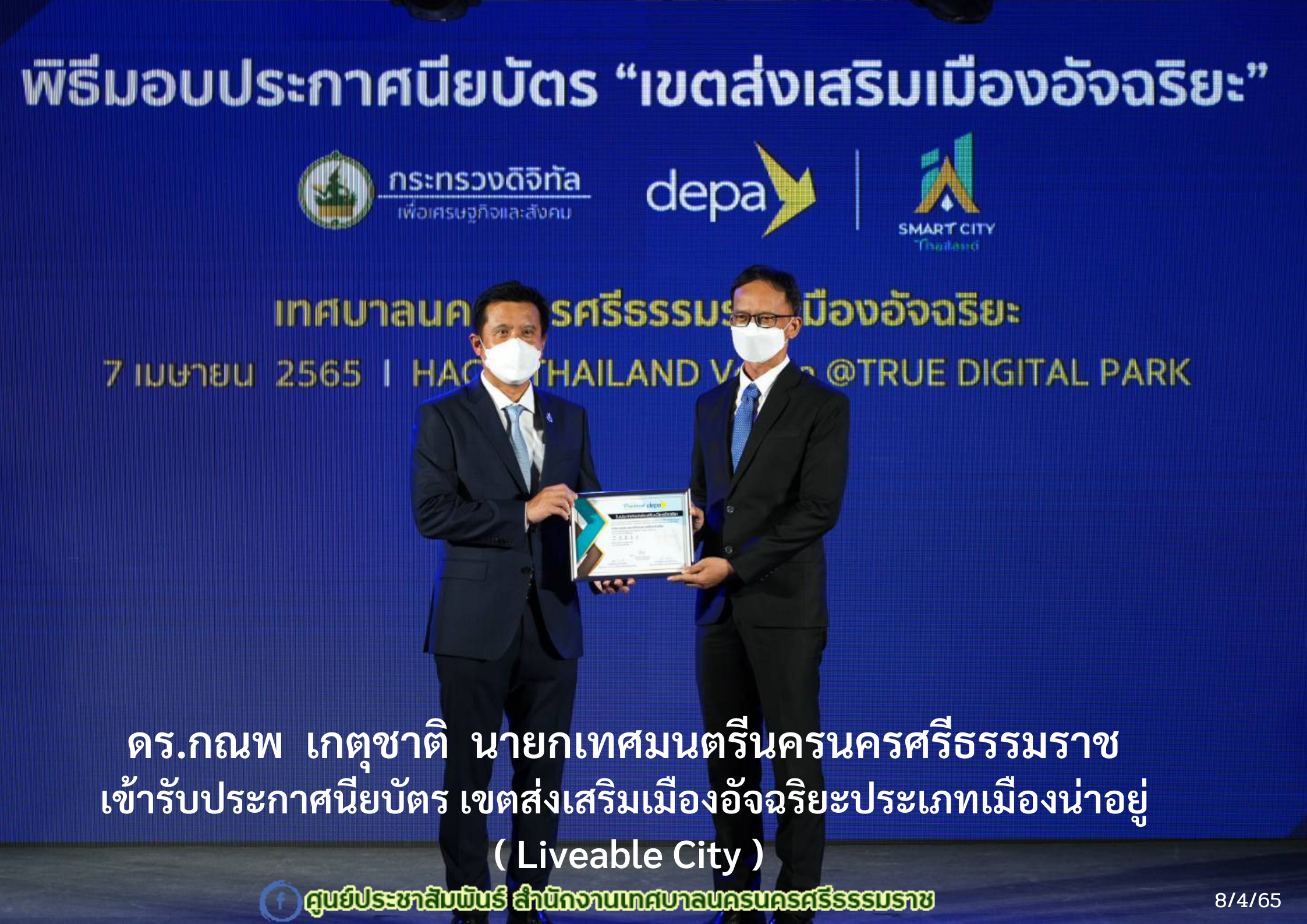 | ดร.กณพ เกตุชาติ นายกเทศมนตรีนครนครศรีธรรมราช เข้ารับใบประกาศนียบัตร เขตส่งเสริมเมืองอัจฉริยะประเภทเมืองน่าอยู่ ( Liveable City ) |