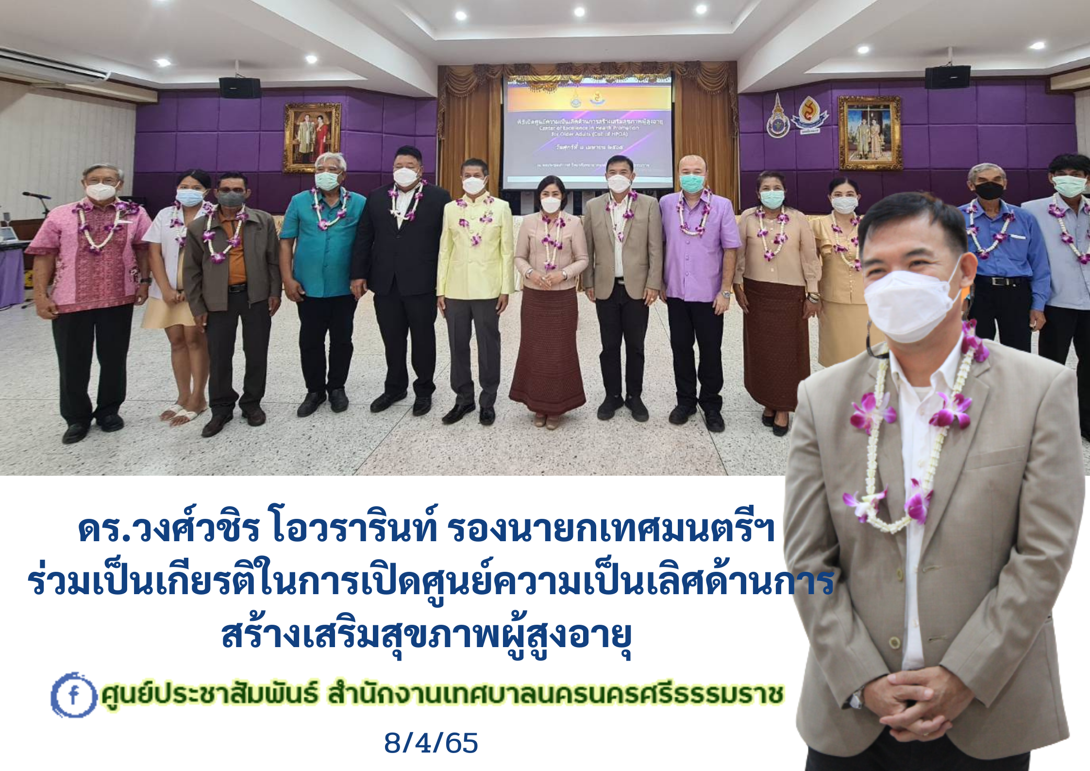 | วันศุกร์ ที่ 8 เมษายน 2565 เวลา 13.30. – 16.30 น. ณ ห้องประชุมเสาวรส วิทยาลัยพยาบาลบรมราชชนนี นครศรีธรรมราช ดร.วงศ์วชิร โอวรารินท์ รองนายกเทศมนตรีนครนครศรีธรรมราช ร่วมเป็นเกียรติในการเปิดศูนย์ความเป็นเลิศด้านการสร้างเสริมสุขภาพผู้สูงอายุ ด้วยวิทยาลัยพยาบาลบรมราชชนนี นครศรีธรรมราช ใด้ดำเนินการ่ศูนย์ความเป็นเลิศ ด้านการสร้างเสริมสุขภาพผู้สูงอายุ Center of Excellence in Health Promotion for Older Adults (COE of HPOA) มีการให้บริการคลินิกต่าง ๆ สำหรับผู้สูงอายุ ดังนี้ คลินิกสมรรถภาพทางกาย คลินิกโภชนาการ คลินิกข้อเข่าเสื่อม คลินิกใส่ใจสมอง และคลินิกสุขภาพจิต โดยอยู่ภายใต้ของหน่วยบริการ ทางการแพทย์และสาธารณสุขสาธิต |