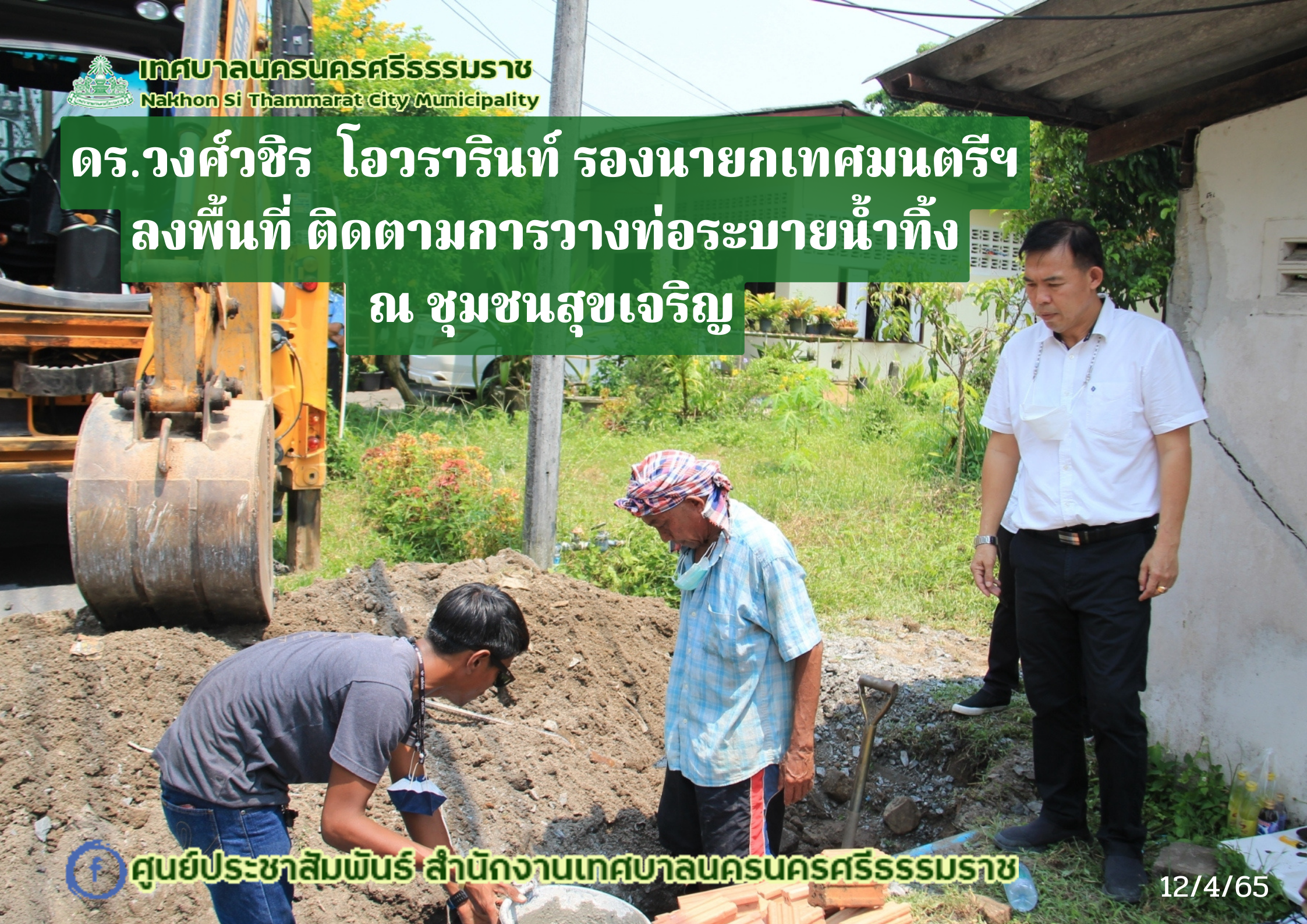 | ดร.วงศ์วชิร โอวรารินท์ รองนายกเทศมนตรีนครนครศรีธรรมราช พร้อมด้วยสมาชิกสภาเทศบาลนครนครศรีธรรมราช เขต 4 ลงพื้นที่ ติดตามการวางท่อระบายน้ำทิ้ง ณ ชุมชนสุขเจริญ |
