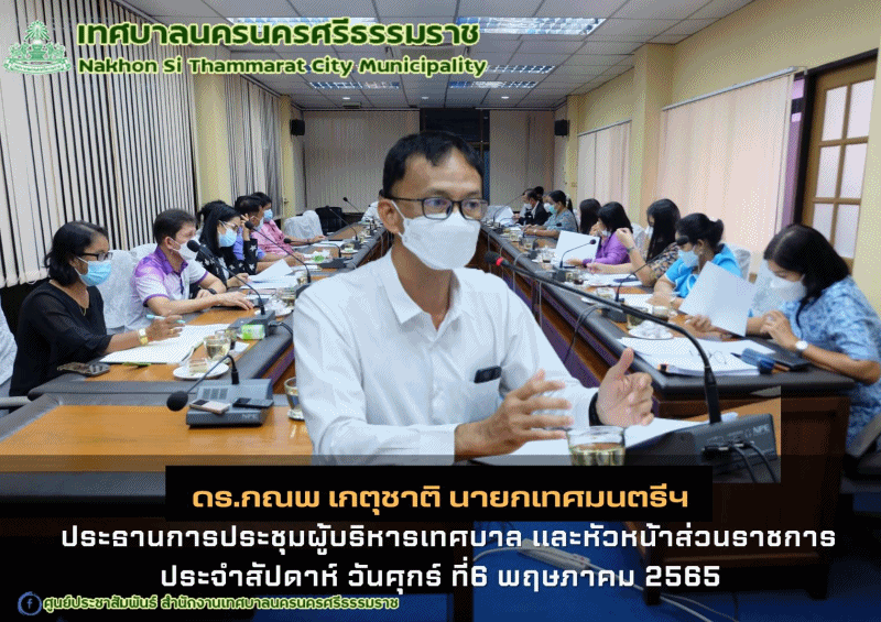 | วันศุกร์ ที่ 6 พฤษภาคม พ.ศ. 2565 เวลา 10.00. น. ณ ห้องประชุมเทศบาลนครนครศรีธรรมราช ชั้น2 ดร.กณพ เกตุชาติ นายกเทศมนตรีนครนครศรีธรรมราช เป็นประธานการประชุมผู้บริหารเทศบาล และหัวหน้าส่วนราชการ ครั้งที่ 11/2565 เพื่อติดตามผลการปฎิบัติราชการดังนี้