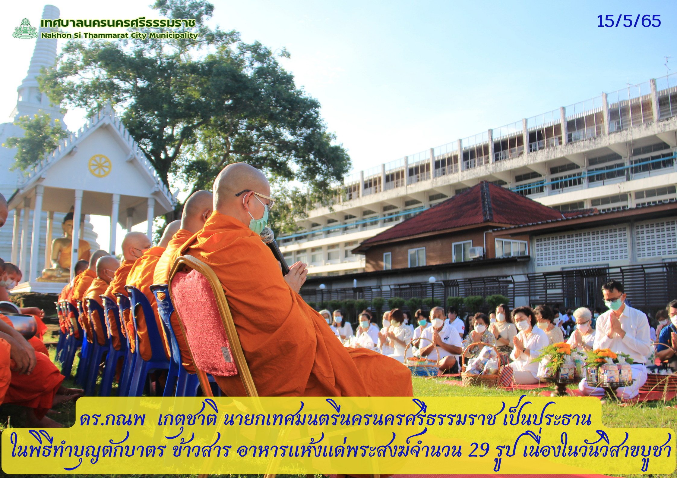 | ดร.กณพ เกตุชาติ นายกเทศมนตรีนครนครศรีธรรมราช เป็นประธาน ในพิธีทำบุญตักบาตร ข้าวสาร อาหารแห้งแด่พระสงฆ์จำนวน 29 รูป เนื่องในวันวิสาขบูชา ประจำปี 2565 |