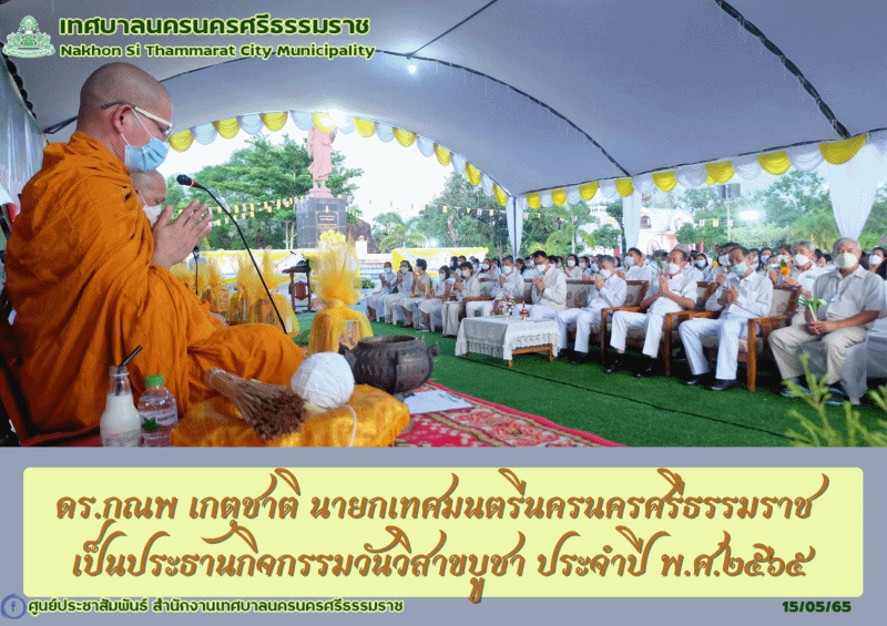 | วันอาทิตย์ ที่ ๑๕ พฤษภาคม ๒๕๖๕ เวลา ๑๗.๓๐ น. ณ พุทธภูมิ สวนสมเด็จพระศรีนครินทร์’ ๘๔ (ทุ่งท่าลาด) ดร.กณพ เกตุชาติ นายกเทศมนตรีนครนครศรีธรรมราช เป็นประธานกิจกรรมวันวิสาขบูชา พร้อมด้วยผู้บริหาร หัวหน้าส่วนราชการ สมาชิกสภาเทศบาล และพุทธศาสนิกชน ร่วมกันประกอบพิธีสวดมนต์ทำนองสรภัญญะ เจริญพระพุทธมนต์ เจริญจิตตภาวนา ปาฐกถาธรรมและเวียนเทียน เพื่อส่งเสริมให้พุทธศาสนิกชนได้ร่วมทำบุญ ทำนุบำรุงพระพุทธศาสนา รักษาศีล และฟังธรรมเทศนา เป็นการรำลึกถึงเหตุการณ์อันน่าอัศจรรย์ทั้ง ๓ ประการ ที่มาบังเกิดในวันเดียวกัน และนำหลักคำสอนของพระพุทธองค์มาเป็นแนวทางในการประพฤติปฏิบัติในการดำรงชีวิตซึ่งเป็นเอกลักษ์ของชาวนครศรีธรรมราช ...............