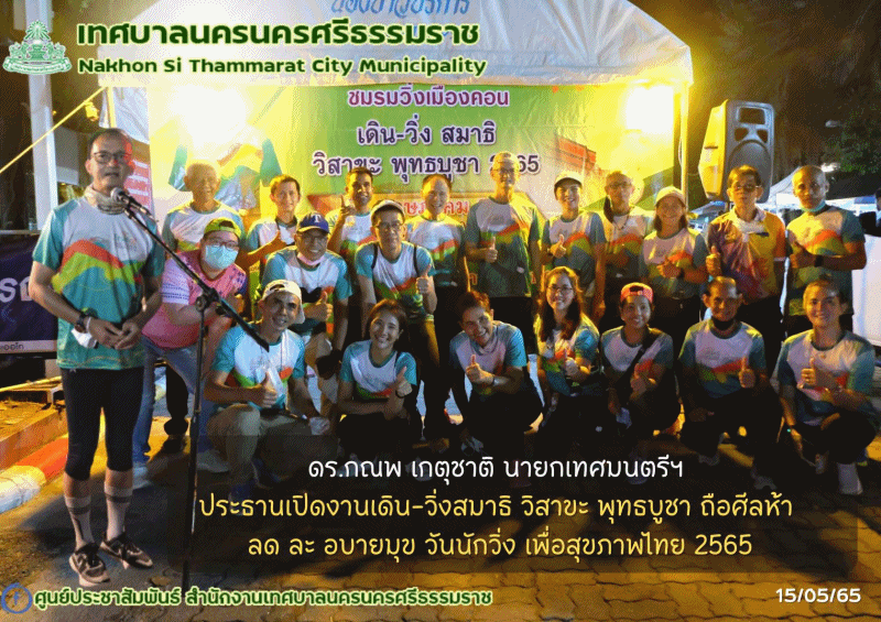| วันอาทิตย์ ที่15 พฤษภาคม 2565 เวลา 19.30 น. ดร.กณพ เกตุชาติ นายกเทศมนตรีนครนครศรีธรรมราช เป็นประธานพิธีเปิดงาน เดิน-วิ่งสมาธิ พุทธบูชา ถือศีลห้า ลด ละ อบายมุข วันนักวิ่ง เพื่อสุขภาพไทย 2565 ณ วัดพระมหาธาตุ วรมหาวิหาร โดยกิจกรรมในครั้งนี้จัดขึ้น เพื่อเป็นพุทธบูชา ถวายแด่องค์สมเด็จพระสัมมาสัมพุทธเจ้า รณรงค์ให้ประชาชนมีกิจกรรมทางกายที่เหมาะสม และออกกำลังกายด้วยการเดิน-วิ่งสมาธิ เพื่อสุขภาพกายและสุขภาพจิตเพิ่มมากขึ้น โดยกำหนดให้มีวันนี้เป็น “วันนักวิ่งเพื่อสุขภาพไทย” …………………… ภาพ//ข่าว//จันทร์จิรา |