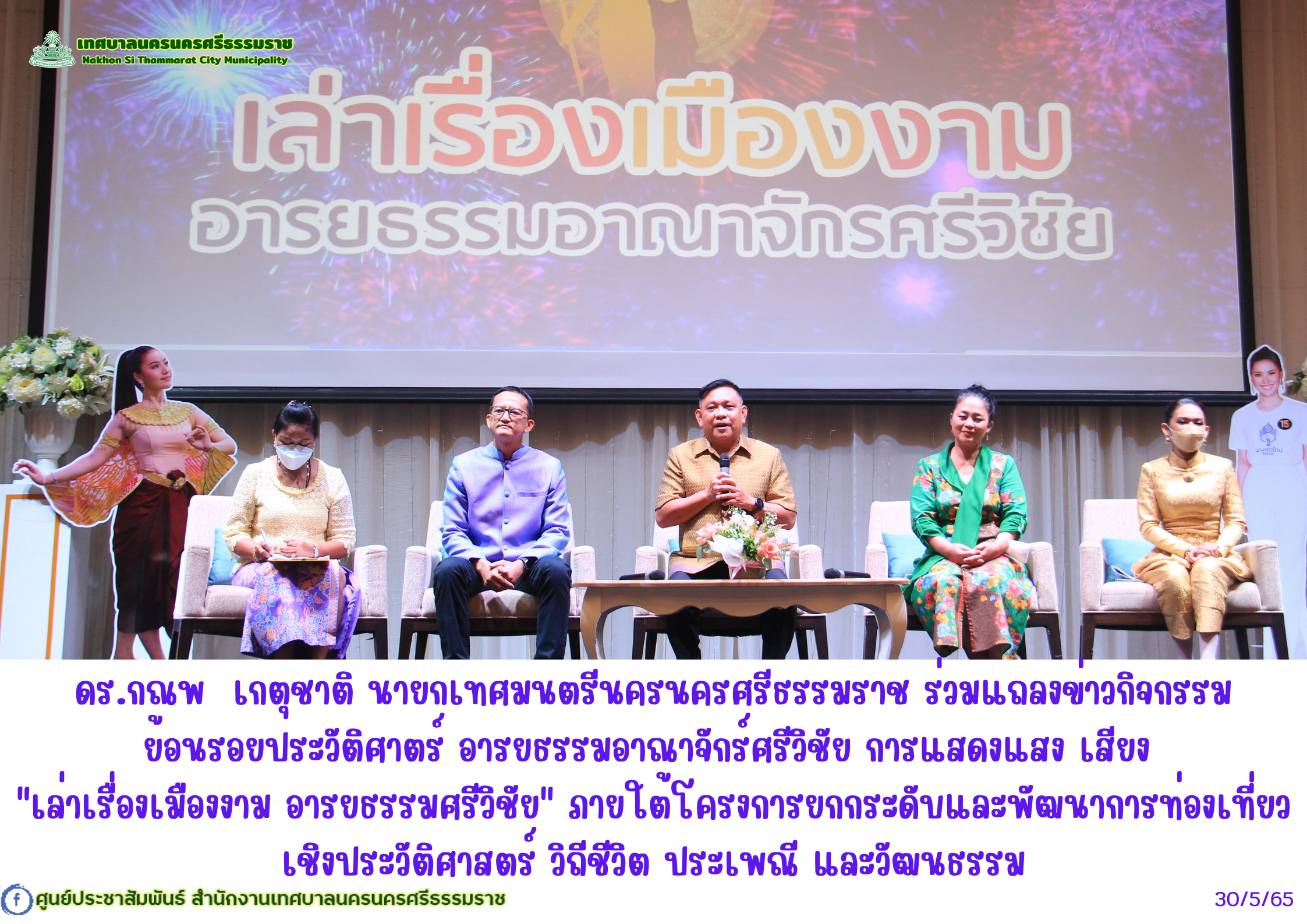 | วันจันทร์  ที่ 30 พฤษภาคม 2565 เวลา 13.30 น. ณ โรงแรมแกรนด์ ฟอร์จูน ดร.กณพ เกตุชาติ นายกเทศมนตรีนครนครศรีธรรมราช ร่วมแถลงข่าวกิจกรรม ย้อนรอยประวัติศาสตร์ อารยธรรมอาณาจักรศรีวิชัย การแสดงแสง เสียง "เล่าเรื่องเมืองงาม อารยธรรมศรีวิชัย" ภายใต้โครงการยกกระดับและพัฒนาการท่องเที่ยวเชิงประวัติศาสตร์ วิถีชีวิต ประเพณี และวัฒนธรรม  โดยมี นายไกรศร  วิศิษฎ์วงศ์ ผู้ว่าราชการจัดหวัดนครศรีธรรมราช เป็นประธานในพิธี    |