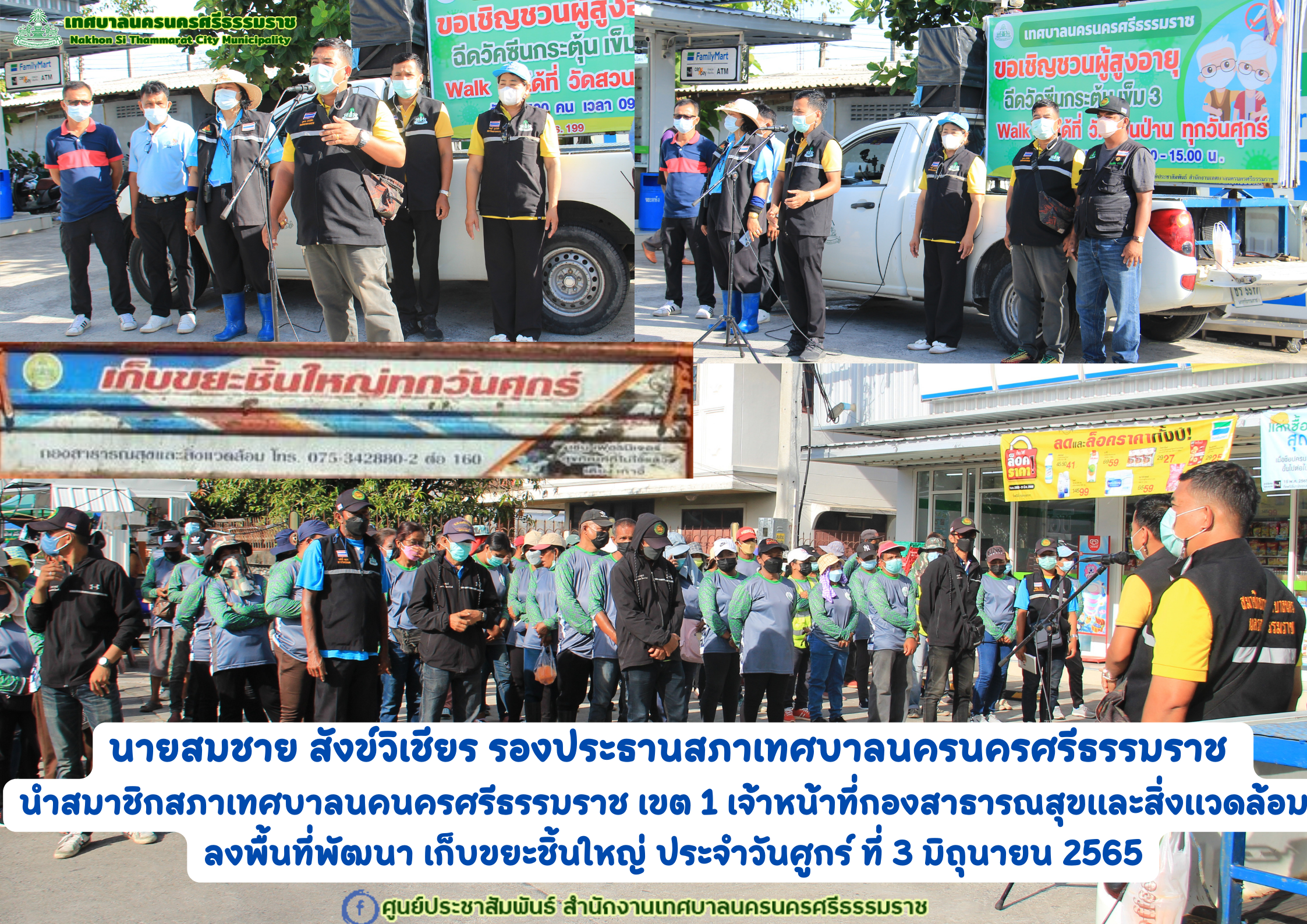 | วันศุกร์ ที่ 3 มิถุนายน 2565 เวลา 08.00 น. นายสมชาย สังข์วิเชียร รองประธานสภาเทศบาลนครนครศรีธรรมราช นำสมาชิกสภาเทศบาลนคนครศรีธรรมราช เขต 1 และเจ้าหน้าที่กองสาธารณสุขและสิ่งแวดล้อม ลงพื้นที่พัฒนา เก็บขยะชิ้นใหญ่ สิ่งของชำรุดเศษวัสดุ อาทิ ที่นอนขนาดใหญ่ เตียง โต๊ะ เก้าอี้ พร้อมทั้ง เก็บกวาดขยะทั่วไป ตัดหญ้า และฉีดล้างถนน ณ ชุมชนหน้าพระธาตุ บริเวณ ซอยศรีธรรมโศก 1 -2 และบริเวณใกล้เคียง เพื่อความสะอาด สวยงาม และเป็นระเบียบเรียบร้อยของชุมชน