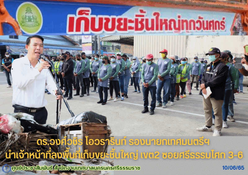 | ดร.วงศ์วชิร โอวรารินท์ รองนายกเทศมนตรีนครนครศรีธรรมราช นำสมาชิกสภาเทศบาล เขต 2 และเจ้าหน้าที่กองสาธารณสุขและสิ่งแวดล้อม ลงพื้นที่เก็บขยะชิ้นใหญ่ ซอยศรีธรรมโศก 3-6 |