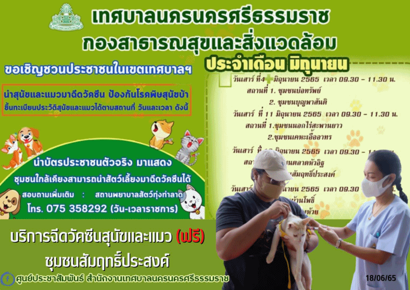 | เทศบาลนครนครศรีธรรมราช โดยกองสาธารณสุขและสิ่งแวดล้อม เดินหน้าออกหน่วยบริการฉีดวัคซีนสุนัขและแมว (ฟรี) |