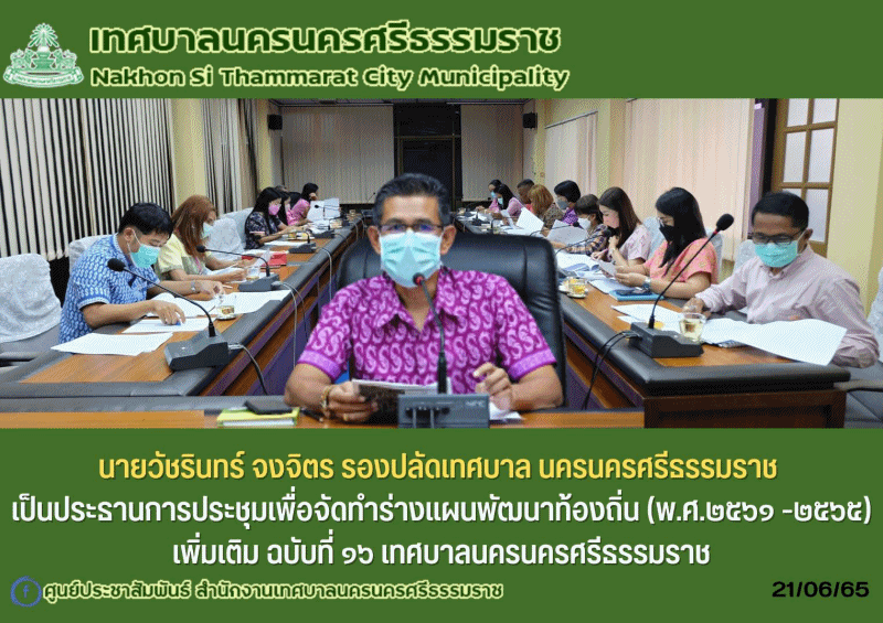 | นายวัชรินทร์ จงจิตร รองปลัดเทศบาล นครนครศรีธรรมราช เป็นประธานการประชุมเพื่อจัดทำร่างแผนพัฒนาท้องถิ่น (พ.ศ.2561 – 2565) เพิ่มเติม ฉบับที่ 16 เทศบาลนครนครศรีธรรมราช |