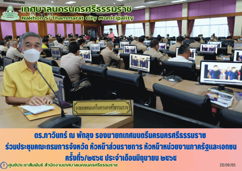 | ดร.ภาวินทร์ ณ พัทลุง รองนายกเทศมนตรีนครนครศรีธรรมราช ร่วมประชุมคณะกรมการจังหวัด หัวหน้าส่วนราชการ หัวหน้าหน่วยงานภาครัฐและเอกชน ครั้งที่ ๖/๒๕๖๕ ประจำเดือนมิถุนายน ๒๕๖๕ |