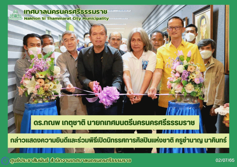 | ดร.กณพ เกตุชาติ นายกเทศมนตรีนครนครศรีธรรมราช กล่าวแสดงความยินดีและร่วมพิธีเปิดนิทรรศการศิลปินแห่งชาติ ครูชำนาญ นาคินทร์ |