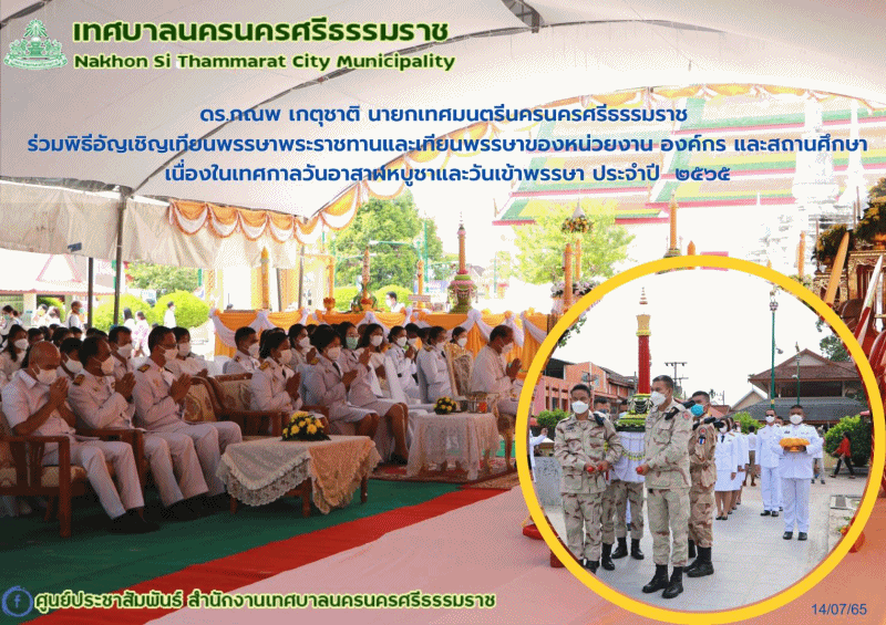 | ดร.กณพ เกตุชาติ นายกเทศมนตรีนครนครศรีธรรมราช ร่วมพิธีอัญเชิญเทียนพรรษาพระราชทานและเทียนพรรษาของหน่วยงาน องค์กร และสถานศึกษา เนื่องในเทศกาลวันอาสาฬหบูชาและวันเข้าพรรษา ประจำปี 2565 |