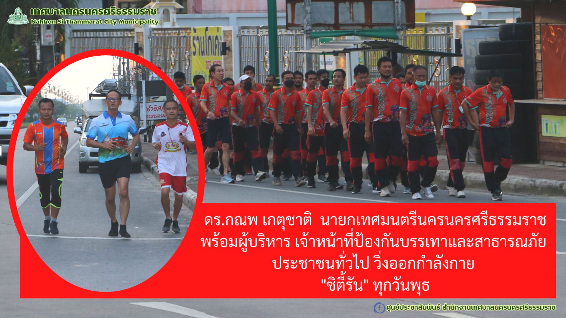 | นายกเทศมนตรีนครนครศรีธรรมราช พร้อมผู้บริหาร เจ้าหน้าที่ป้องกันบรรเทาและสาธารณภัย ประชาชนทั่วไป วิ่งออกกำลังกาย "ซิตี้รัน" ทุกวันพุธ |