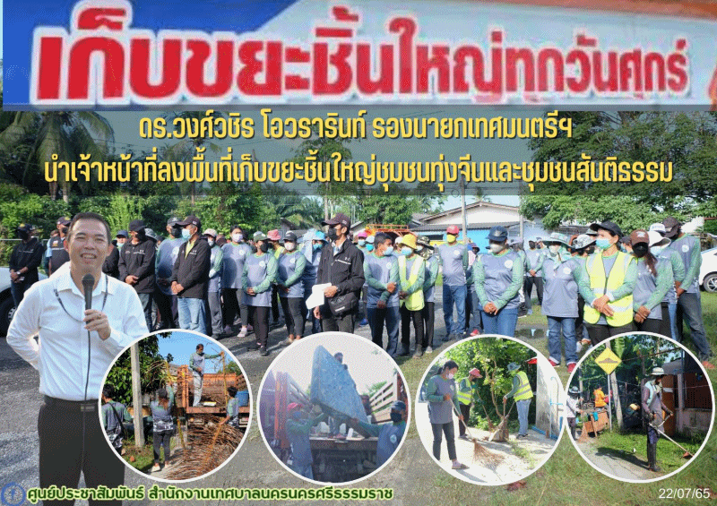 | ดร.วงศ์วชิร โอวรารินท์ รองนายกเทศมนตรีนครนครศรีธรรมราช นำสมาชิกสภาเทศบาล เขต 4 และเจ้าหน้าที่กองสาธารณสุขและสิ่งแวดล้อม ลงพื้นที่เก็บขยะชิ้นใหญ่ ชุมชนทุ่งจีนและชุมชนสันติธรรม |