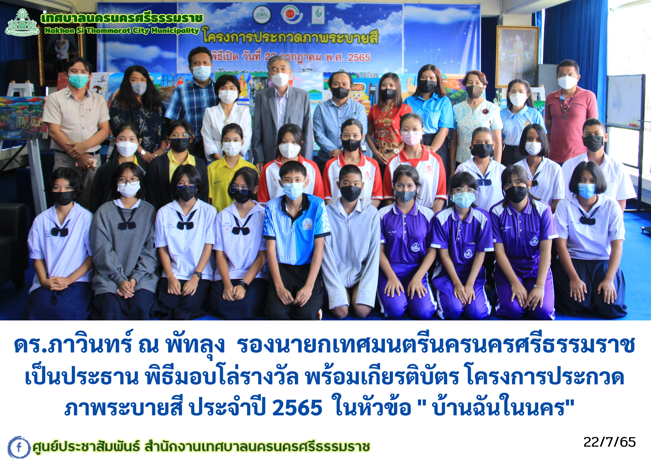 | ดร.ภาวินทร์ ณ พัทลุง รองนายกเทศมนตรีนครนครศรีธรรมราช เป็นประธาน พิธีมอบโล่รางวัล พร้อมเกียรติบัตร โครงการประกวดภาพระบายสี ประจำปี 2565 ในหัวข้อ " บ้านฉันในนคร" |