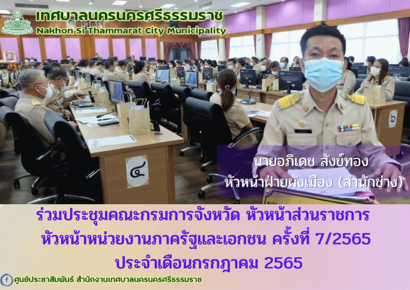 | นายอภิเดช สังข์ทอง หัวหน้าฝ่ายผังเมือง (สำนักช่างเทศบาลนครนครศรีธรรมราช) ร่วมประชุมคณะกรมการจังหวัด หัวหน้าส่วนราชการ หัวหน้าหน่วยงานภาครัฐและเอกชน ครั้งที่ 7/๒๕๖๕ ประจำเดือนกรกฎาคม ๒๕๖๕ |