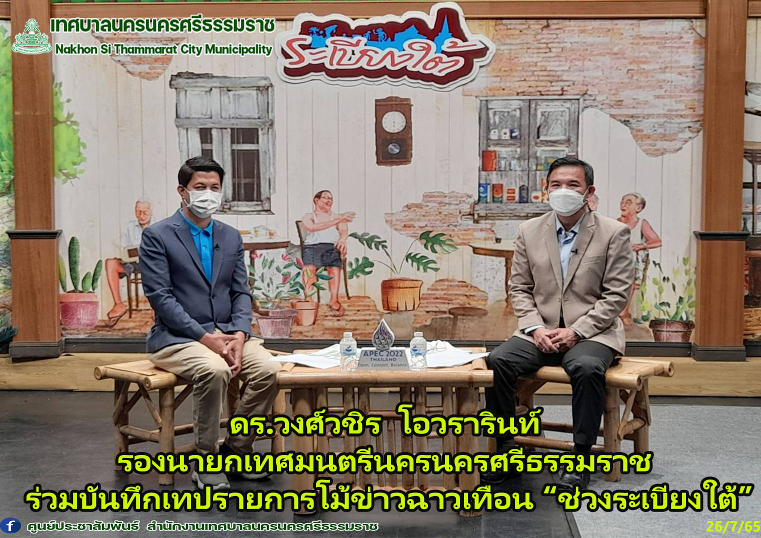 วันอังคาร ที่ 26 กรกฎาคม 2565 เวลา 16.00 น. ณ สถานีโทรทัศน์แห่งประเทศไทย ช่อง 11 นครศรีธรรมราช ดร.วงศ์วชิร โอวรารินท์ รองนายกเทศมนตรีนครนครศรีธรรมราช ร่วมรายการ “ ระเบียงใต้” ถามตรงตอบตรงชัด ประเด็นเทศบาลนครนครศรีธรรมราช พบประชาชน โดยกล่าวในรายการถึงการดำเนินงาน ถึงประเด็นสำคัญ ดังนี้ 1.การดำเนินการจัดอบรมโครงการเมืองนครอาหารปลอดภัย ประจำปีงบประมาณ 2565 ซึ่งจัดอบรมให้แก่ผู้ประกอบการร้านค้า ร้านอาหาร ในเขตเทศบาลนครนครศรีธรรมราช 2. การดำเนินการจัดอบรมโครงการป้องกันควบคุมสัตว์และแมลงพาหะนำโรค ประจำปีงบประมาณ 2565 ให้แก่ อสม. 3. การดำเนินการของกองสาธารณสุขและสิ่งแวดล้อม ในการลงพื้นที่ ฉีดพ่นกำจัดยุงลาย 4. การดำเนินการ ทำความสะอาดตลาดสดคูขวาง 5. การดำเนินการ โครงการนครปลอดถังขยะ มีการติดตามการทิ้งขยะ ของประชาชน 6. การดำเนินการเก็บขยะชิ้นใหญ่ ประจำสัปดาห์ 7. การลงพื้นที่ ดูดท่อ เพื่อเตรียมความพร้อมป้องกันน้ำท่วมในเขตเทศบาลนครนครศรีธรรมราช 8. ประชาสัมพันธ์ การเพิ่มสมาชิก line เทศบาลนครนครศรีธรรมราช โดย @nakhoncity