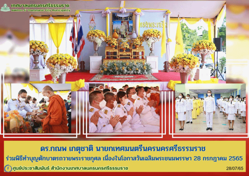 | ดร.กณพ เกตุชาติ นายกเทศมนตรีนครนครศรีธรรมราช ร่วมพิธีทำบุญตักบาตรถวายพระราชกุศล เนื่องในโอกาสวันเฉลิมพระชนมพรรษา 28 กรกฎาคม 2565 |