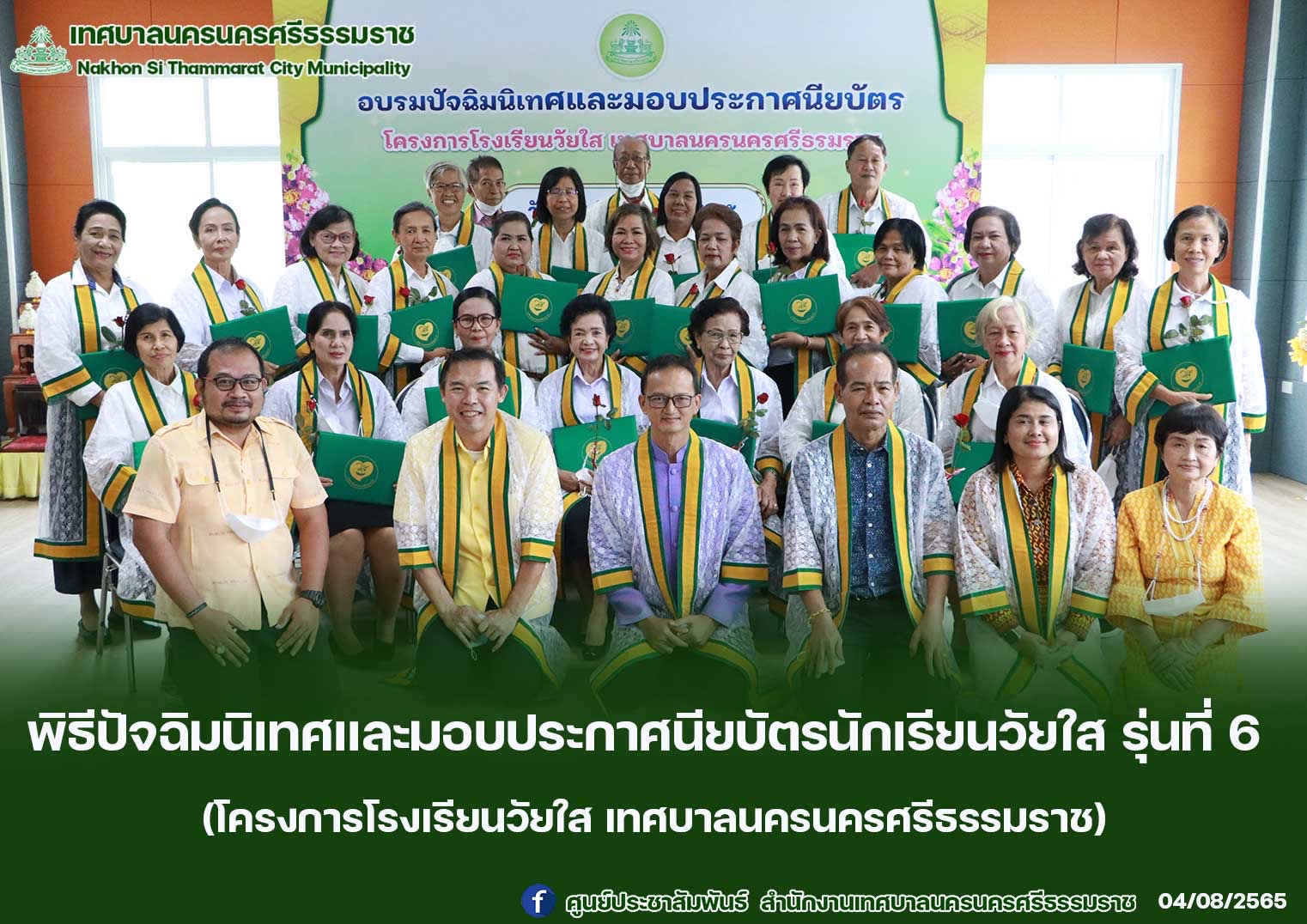 | วันพฤหัสบดี ที่ 4 สิงหาคม 2565 เวลา 08.30 น. ณ ห้องประชุมมวลชนสัมพันธ์ กองสวัสดิการสังคม ดร.กณพ เกตุชาติ นายกเทศมนตรีนครนครศรีธรรมราช เป็นประธานในพิธีปัจฉิมนิเทศและมอบประกาศนียบัตรนักเรียนวัยใส รุ่นที่ 6 แก่ผู้สำเร็จการอบรมโครงการโรงเรียนวัยใส และโครงการโรงเรียนวัยใส มีวัตถุประสงค์เพื่อส่งเสริมการเรียนรู้ตลอดชีวิตให้กับผู้สูงอายุในรูปแบบของโรงเรียนวัยใส โดยจัดกิจกรรมการเรียนให้กับผู้สูงอายุ หลักสูตร120 ชั่วโมง ใช้เวลาเรียนประมาณ 3 เดือน จำนวนผู้เรียนรุ่นละ 30-35 คน สำหรับนักเรียนวัยใส รุ่นที่ 6 มีผู้เรียนจำนวน 33 คน เริ่มตั้งแต่วันที่15 ธันวาคม 2563 - วันที่ 28 เมษายน 2564 ตามหลักสูตร โดยมีครูผู้สอนจำนวน 7 ท่าน และมีผู้สำเร็จการอบรโครงการโรงเรียนวัยใส รุ่นที่6 จำนวนรวม 33 คน (ชาย 4 คน / หญิง 29 คน)