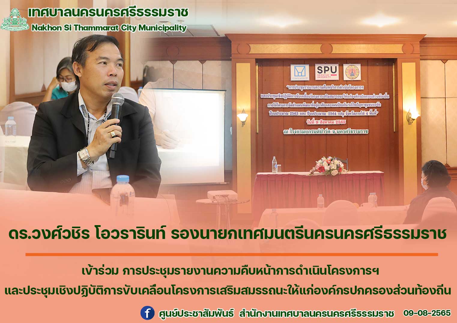 | ดร.วงศ์วชิร โอวรารินท์ รองนายกเทศมนตรีนครนครศรีธรรมราช เข้าร่วม การประชุมรายงานความคืบหน้าการดำเนินโครงการฯและประชุมเชิงปฏิบัติการขับเคลื่อนโครงการเสริมสมรรถนะให้แก่องค์กรปกครองส่วนท้องถิ่น |