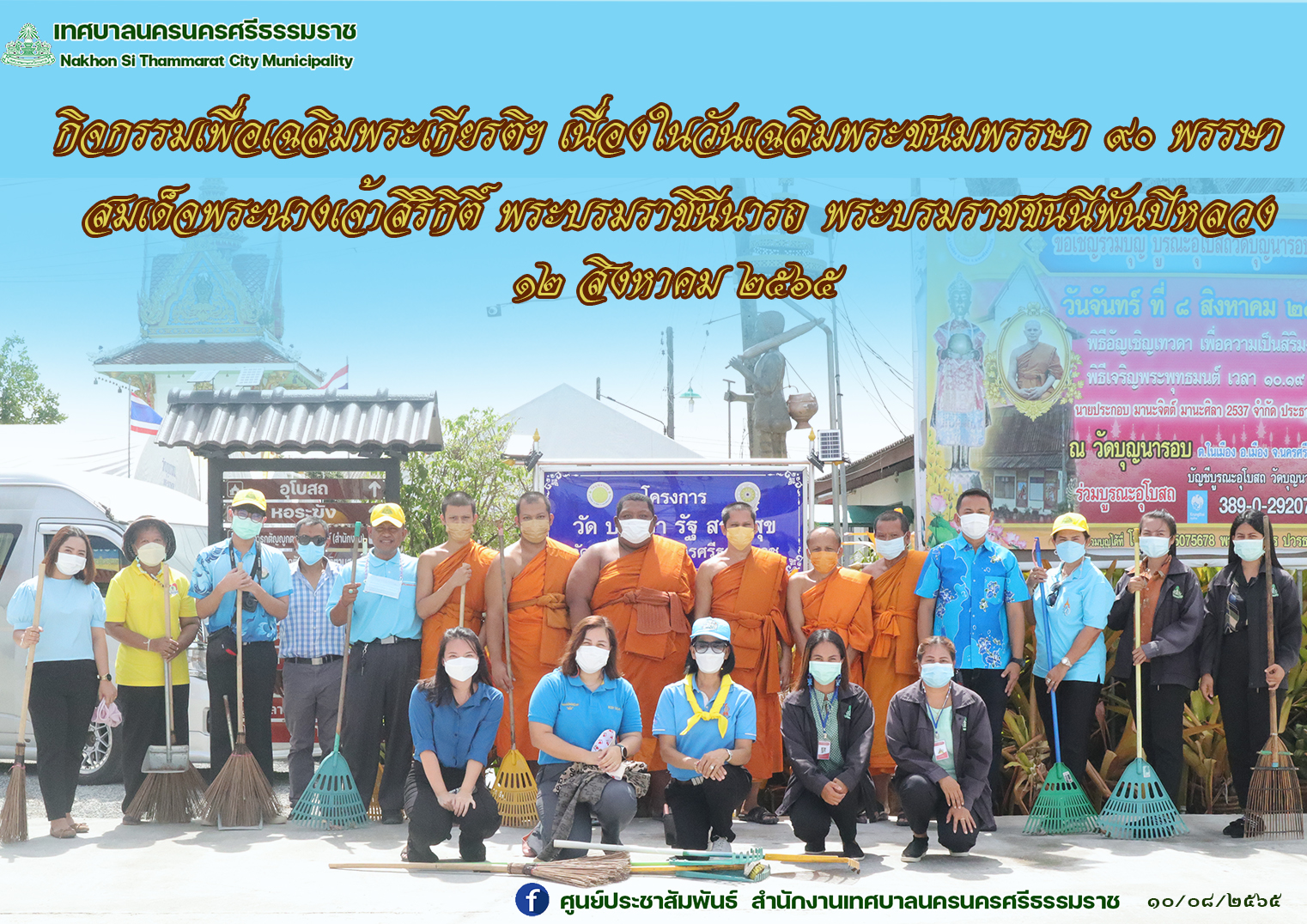 | วันนี้ (10 สิงหาคม 2565 ) เวลา 10.00 น. ณ วัดบุญนารอบ นายธวัช ศรีสมานุวัตร สมาชิกสภาเทศบาลเขตเลือกตั้งที่ 2 นำทีมเจ้าหน้าที่สำนักการศึกษา เทศบาลนครนครศรีธรรมราช และประชาชน ลงพื้นที่พัฒนาปรับปรุงภูมิทัศน์วัดบุญนารอบ อำเภอเมือง จังหวัดนครศรีธรรมราช พร้อมฉีดล้างทำความสะอาดบนถนนรอบพื้นที่วัด กิจกรรมทำความสะอาด (Big Cleaning Day) พร้อมกันทั่วประเทศในวันที่ 10 สิงหาคม 2565 ณ วัดบุญนารอบซึ่งเข้าร่วมโครงการวัด ประชา รัฐ สร้างสุข สำหรับกิจกรรมดังกล่าวเพื่อเฉลิมพระเกียรติฯ เนื่องในวันเฉลิมพระชนมพรรษา 90 พรรษา สมเด็จพระนางเจ้าสิริกิติ์พระบรมราชินีนารถ พระบรมราชชนนีพันปีหลวง 12 สิงหาคม 2565