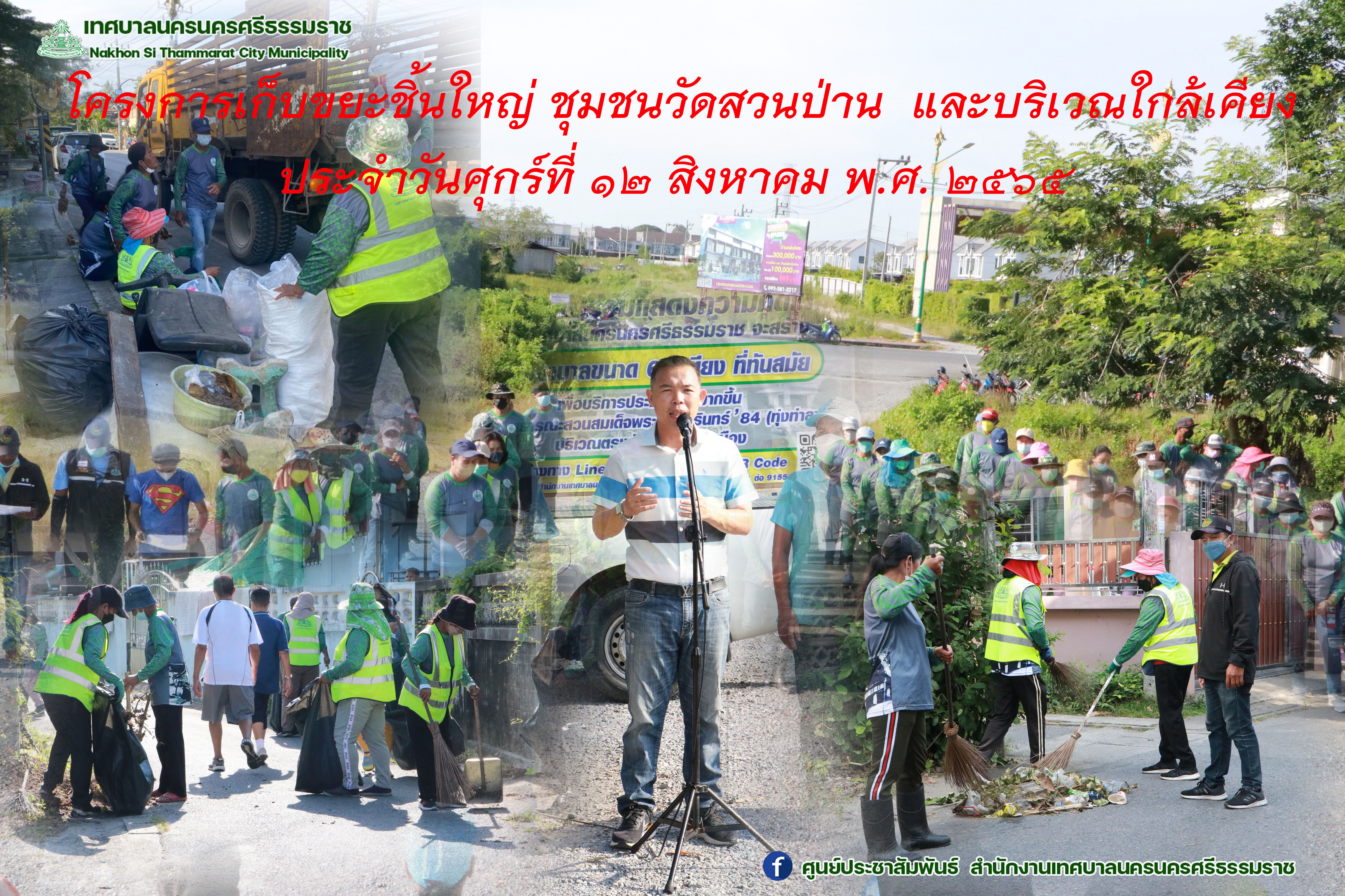 | วันศุกร์ที่ 12 สิงหาคม พ.ศ. 2565 เวลา 07.30 น. ดร.วงศ์วชิร โอวรารินท์ รองนายกเทศมนตรีนครนครศรีธรรมราช พร้อมสมาชิกสภาเทศบาลนคนครศรีธรรมราช และเจ้าหน้าที่กองสาธารณสุขและสิ่งแวดล้อม ลงพื้นที่พัฒนา เก็บขยะชิ้นใหญ่ สิ่งของชำรุดเศษวัสดุ อาทิ ที่นอนขนาดใหญ่ เตียง โต๊ะ เก้าอี้ พร้อมทั้ง เก็บกวาดขยะทั่วไป ตัดหญ้า และฉีดล้างถนน ณ ชุมชนวัดสวนป่าน และบริเวณใกล้เคียง เพื่อความสะอาด สวยงาม และเป็นระเบียบเรียบร้อยของชุมชน