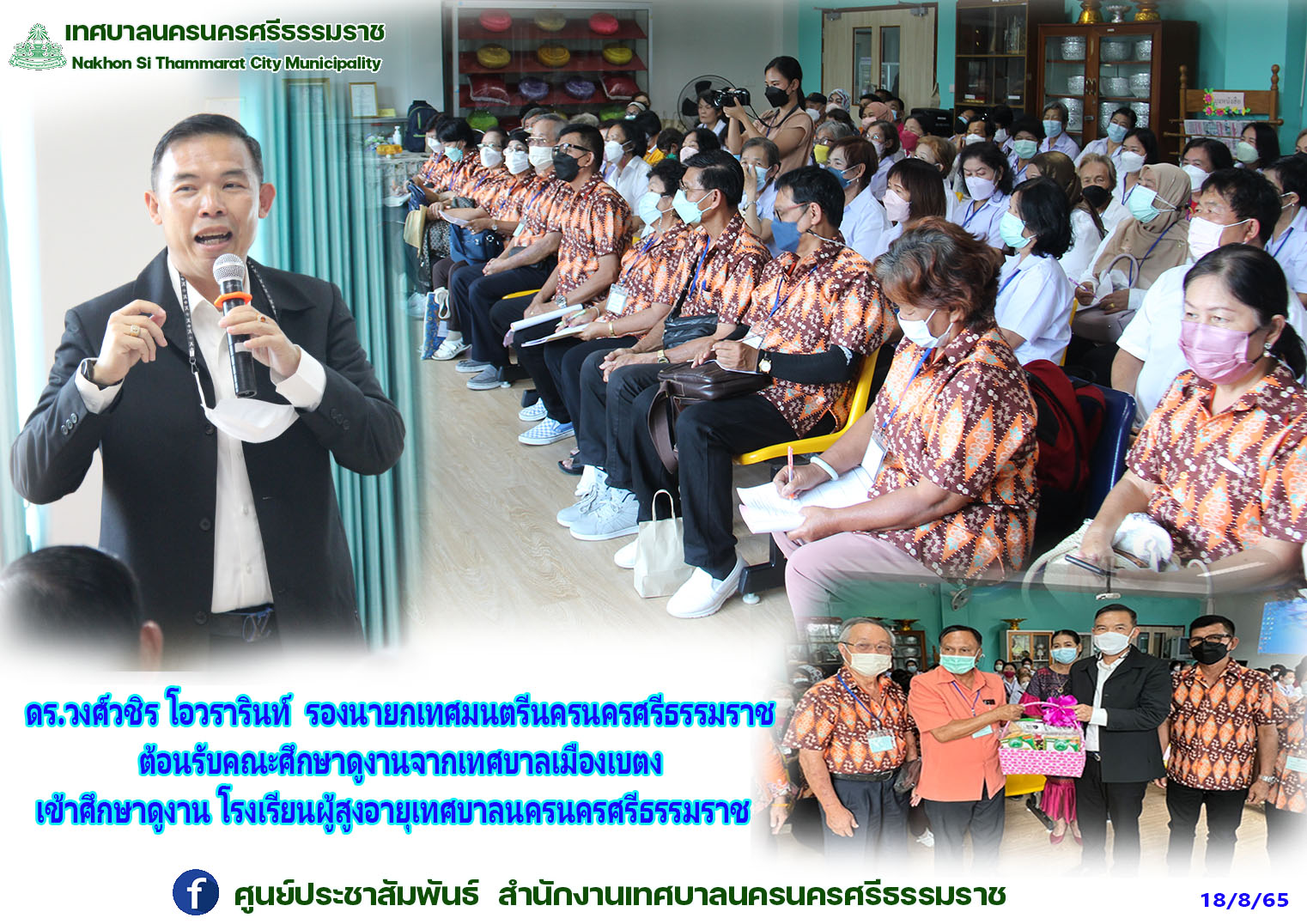 | วันพฤหัสบดีที่ 18 สิงหาคม พ.ศ. 2565 เวลา 14.00 น. ณ กองสวัสดิการสังคม เทศบาลนครนครศรีธรรมราช ดร.วงศ์วชิร โอวรารินท์ รองนายกเทศมนตรีนครนครศรีธรรมราช ต้อนรับคณะศึกษาดูงานจากเทศบาลเมืองเบตง เข้าศึกษาดูงาน โรงเรียนผู้สูงอายุเทศบาลนครนครศรีธรรมราช ตามโครงการพัฒนาคุณภาพชีวิตผู้สูงอายุ โดยมีวัตถุประสงค์ เพื่อให้ผู้สูงอายุมีความรู้ ความเข้าใจในการปฏิบัติตนลดภาวการณ์เกิดโรค รู้จักปรับเปลี่ยนพฤติกรรมในการดูแลสุขภาพ ทราบถึงกฎหมาย สิทธิและสวัสดิการของผู้สูงอายุและสามารถนำปรัชญาเศรษฐกิจพอเพียงเป็นแนวทางในการดำเนินชีวิต เกิดการพัฒนาความคิดในการสร้างงาน สร้างอาชีพที่เหมาะสมให้กับตนเองรวมถึงส่งเสริมการเรียนรู้ เกิดการรวมกลุ่มของผู้สูงอายุในการทำกิจกรรมด้านต่างๆ
