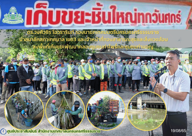 | ดร.วงศ์วชิร โอวรารินท์ รองนายกเทศมนตรีนครนครศรีธรรมราช นำสมาชิกสภาเทศบาล เขต 3 และเจ้าหน้าที่กองสาธารณสุขและสิ่งแวดล้อม ลงพื้นที่เก็บขยะชิ้นใหญ่ พัฒนาคลองชุมชนท่าโพธิ์ และชุมชนท่ามอญ |