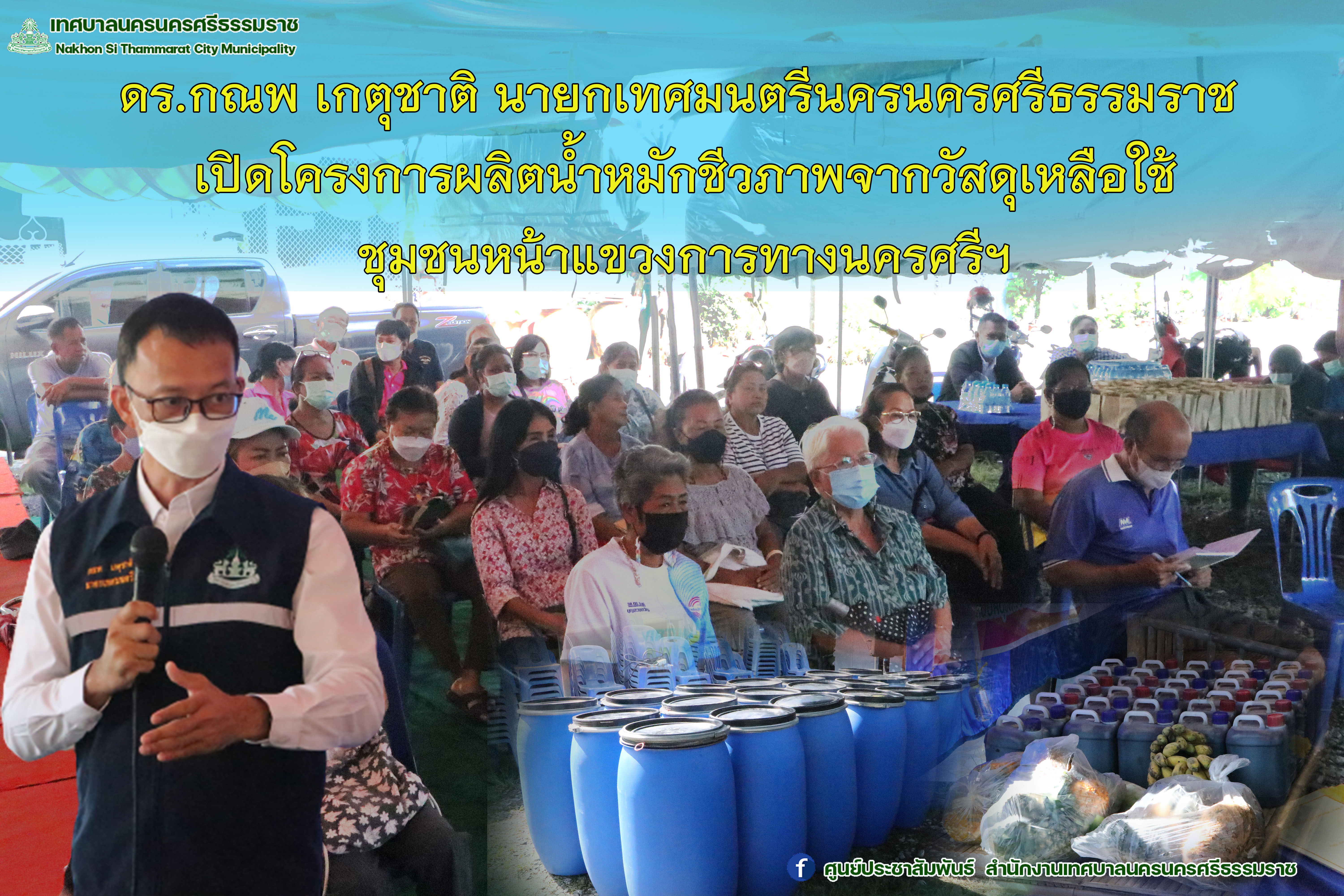 | วันอังคาร ที่ 13 กันยายน 2565 เวลา 09.00 น. ณ ที่ทำการชุมชนหน้าแขวงการทางนครศรีฯ ดร.กณพ เกตุชาติ นายกเทศมนตรีนครนครศรีธรรมราช เป็นประธานเปิดโครงการผลิตน้ำหมักชีวภาพจากวัสดุเหลือใช้ชุมชนหน้าแขวงการทางนครศรีฯ เพื่อให้ประชาชนมีความรู้เกี่ยวกับการทำปุ๋ยชัวภาพ และเพื่อลดปริมาณขยะอินทรีย์ และลดปัญหามลพิษในชุมชน