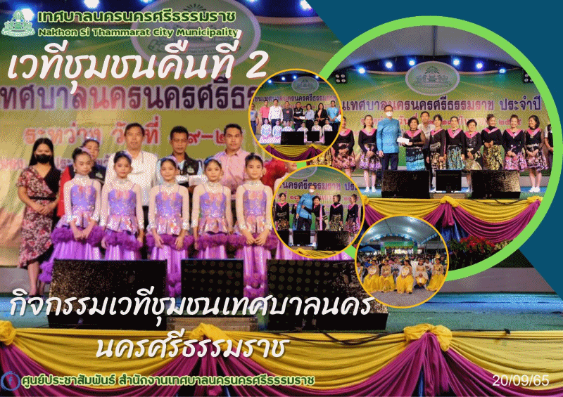 | เทศบาลนครนครศรีธรรมราช ขอเชิญชมการแสดงของชุมชน สังกัดเทศบาลนครนครศรีธรรมราช ณ เวทีชุมชน ในงานประเพณีบุญสารทเดือนสิบและงานกาชาดจังหวัดนครศรีธรรมราช ประจำปี 2565 |