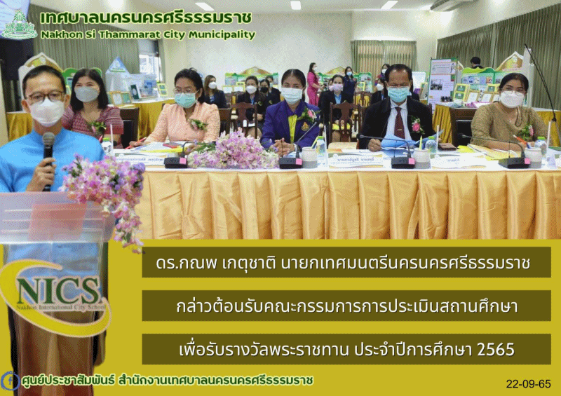 | ดร.กณพ เกตุชาติ นายกเทศมนตรีนครนครศรีธรรมราช กล่าวต้อนรับคณะกรรมการการประเมินสถานศึกษาเพื่อรับรางวัลพระราชทาน ประจำปีการศึกษา 2565 |