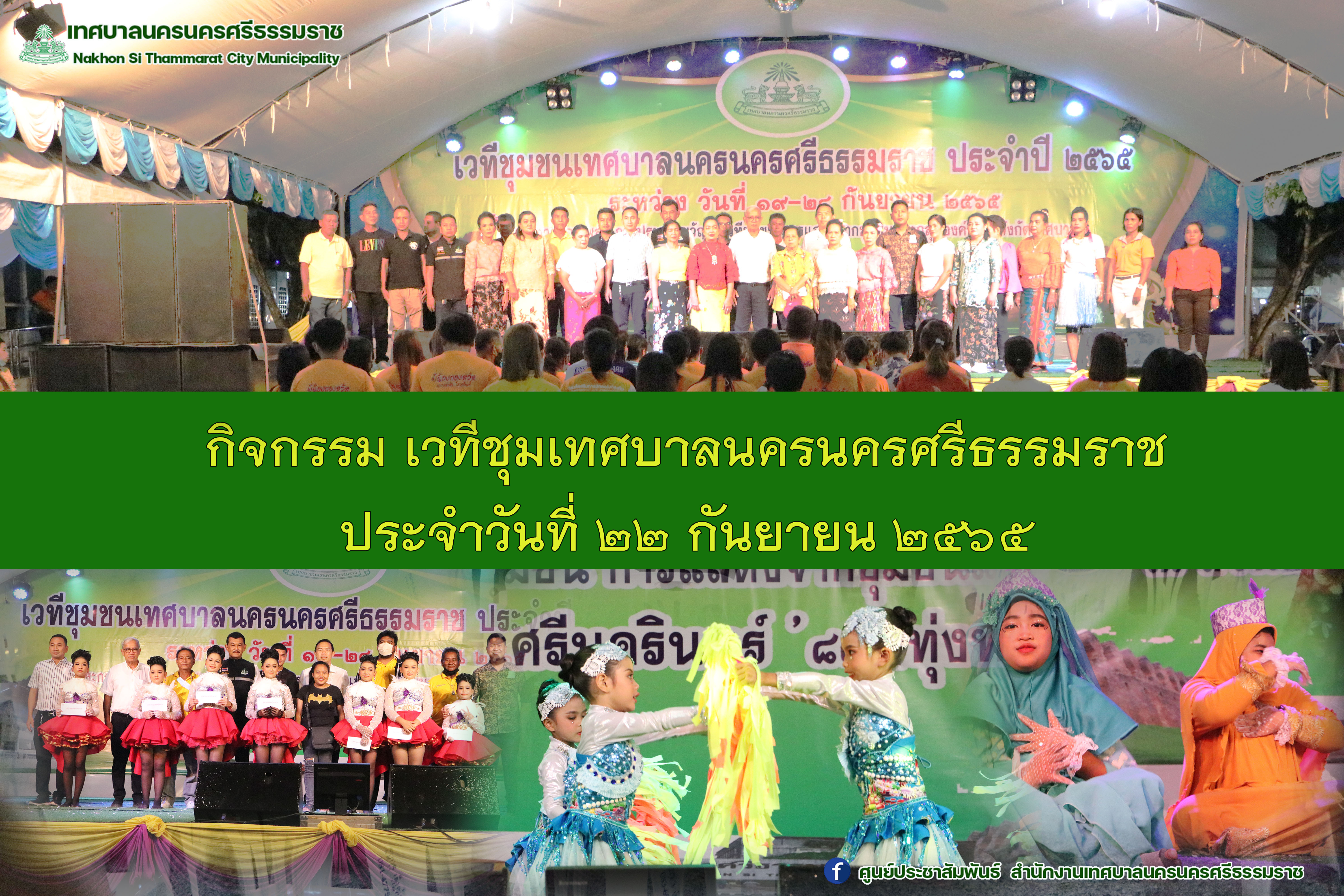 | วันพฤหัสบดี ที่ 22 กันยายน 2565 เวลา 19.30 น. ดร.วงศ์วชิร โอวรารินท์ รองนายกเทศมนตรีนครนครศรีธรรมราช พร้อมด้วยคณะผู้บริหาร สมาชิกสภาเทศบาล และหัวหน้าส่วนราชการ ร่วมกิจกรรมการแสดงเวทีชุมชน ในงานประเพณีบุญสารทเดือนสิบ ประจำปี 2565 ซึ่งจัดขึ้นระหว่างวันที่ 19 -28 กันยายน 2565 ณ สวนสมเด็จพระศรีนครินทร์ ’ 84 (ทุ่งท่าลาด) โดยมีชุดการแสดงของโรงเรียนสังกัดเทศบาลนครนครศรีธรรมราช และการแสดงของชุมชนทั้ง 67 ชุมชน ทั้งนี้เพื่อส่งเสริมให้ประชาชนเกิดความรักความสามัคคีในหมู่คณะ ให้เด็กและ เยาวชน มีความกล้าแสดงออก และเพื่อส่งเสริมให้ประชาชนสืบสานประเพณีบุญสารทเดือนสิบ ซึ่งถือว่าเป็นประเพณีที่สำคัญของจังหวัดนครศรีธรรมราช จึงขอเชิญชวนประชาชน และนักท่องเที่ยว ชมการแสดงของเวทีชุมชน เทศบาลนครนครศรีธรรมราช บริเวณสำนักงานกองสวัสดิการสังคม ได้ทุกค่ำคืน ตั้งแต่เวลา 19.30 น. เป็นต้นไป