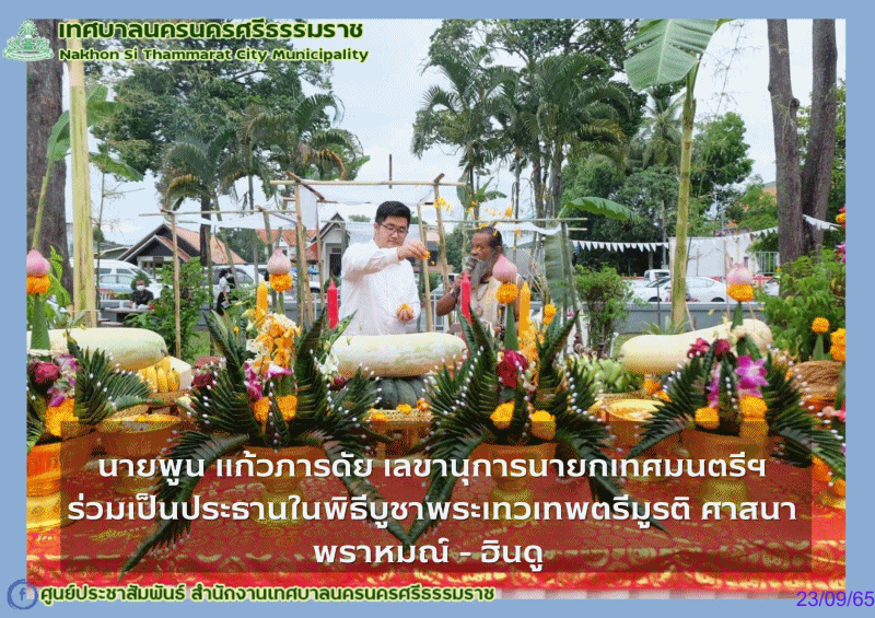 | วันศุกร์ ที่23 กันยายน 2565 เวลา 15.00 น. นายพูน แก้วภารดัย เลขานุการนายกเทศมนตรีนครนครศรีธรรมราช ร่วมเป็นประธานในพิธีบูชาพระเทวเทพตรีมูรติ ศาสนาพราหมณ์ -ฮินดู ณ หอพระนารายณ์ - หอพระอิศวร พิธีในครั้งนี้ เพื่อสนับสนุน สืบสานกิจกรรมมงคลสืบสานศาสนาวัฒนธรรมประเพณีสารทเดือนสิบ และส่งเสริมการท่องเที่ยวให้เกิดขึ้นในจังหวัดนครศรีธรรมราช |