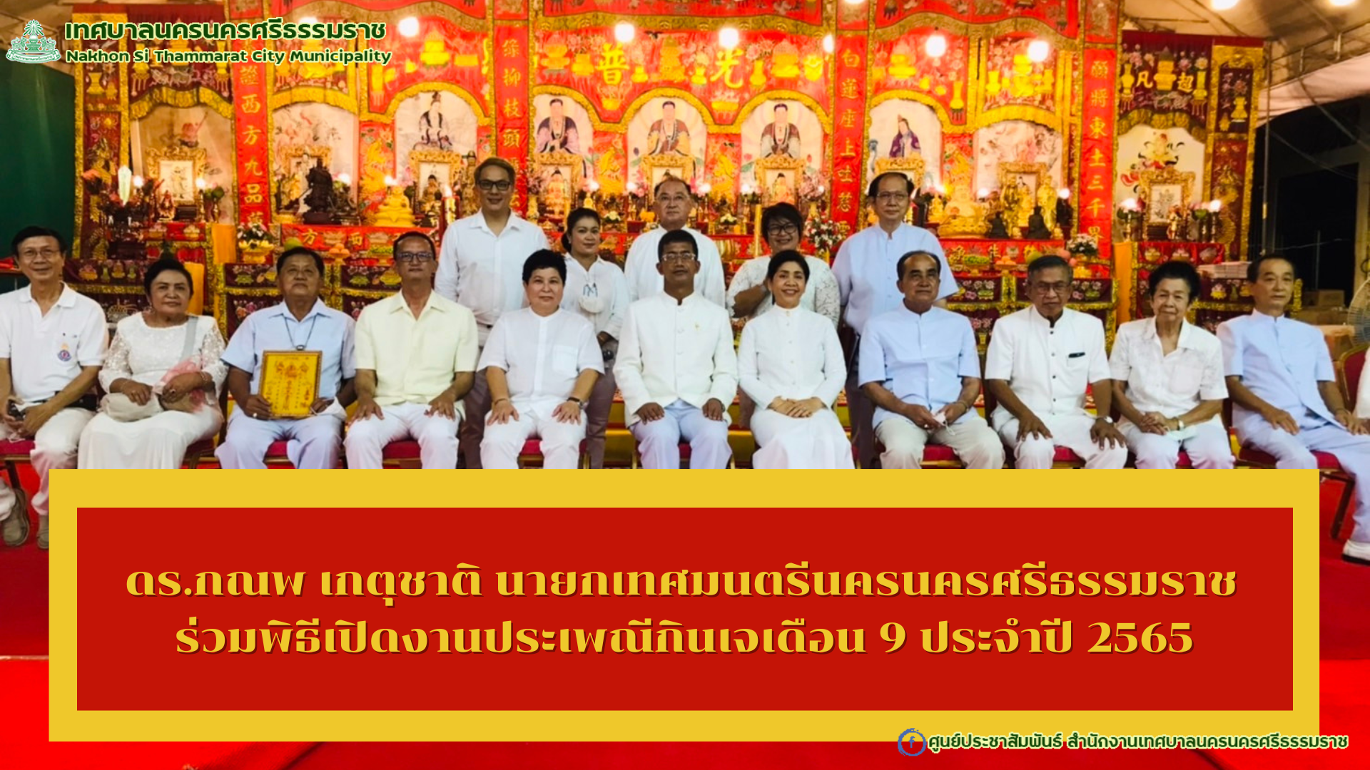 | วันอาทิตย์ที่ 25 กันยายน 2565 เวลา 18.30 น. ดร.กณพ เกตุชาติ นายกเทศมนตรีนครนครศรีธรรมราช ร่วมพิธีเปิดงานประเพณีกินเจเดือน 9 ประจำปี 2565 ณ ศาลเจ้ากวนอู และลานหน้าสมาคมพาณิชย์จีน อำเภอเมืองนครศรีธรรมราช ทั้งนี้มีนายสมพงษ์มากมณี รองผู้ว่าราชการจังหวัดนครศรีธรรมราช เป็นประธานในพิธี