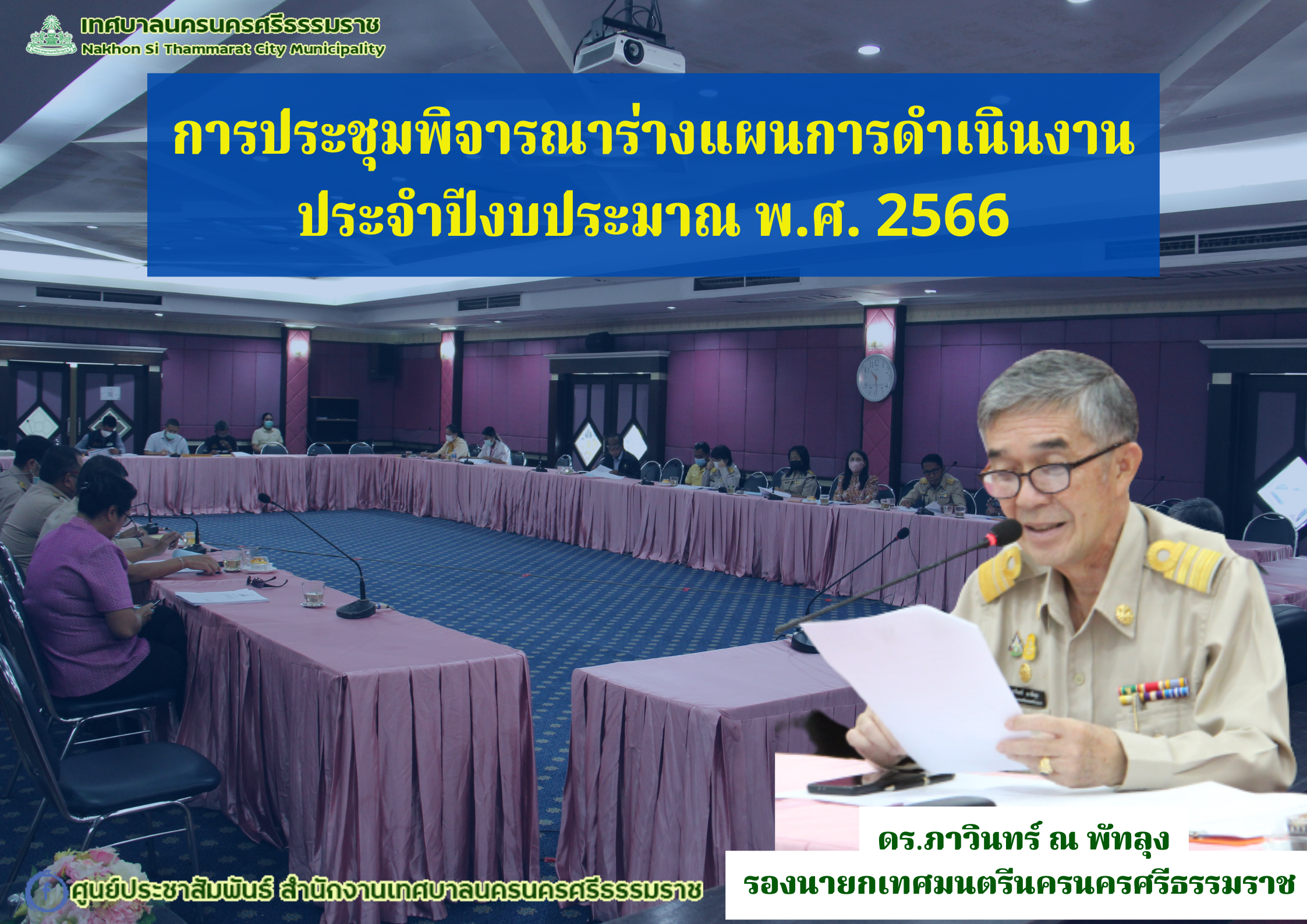 | ดร.ภาวินทร์ ณ พัทลุง รองนายกเทศมนตรีนครนครศรีธรรมราช เป็นประธานการประชุมพิจารณาร่างแผนการดำเนินงาน ประจำปีงบประมาณ พ.ศ. 2566 |
