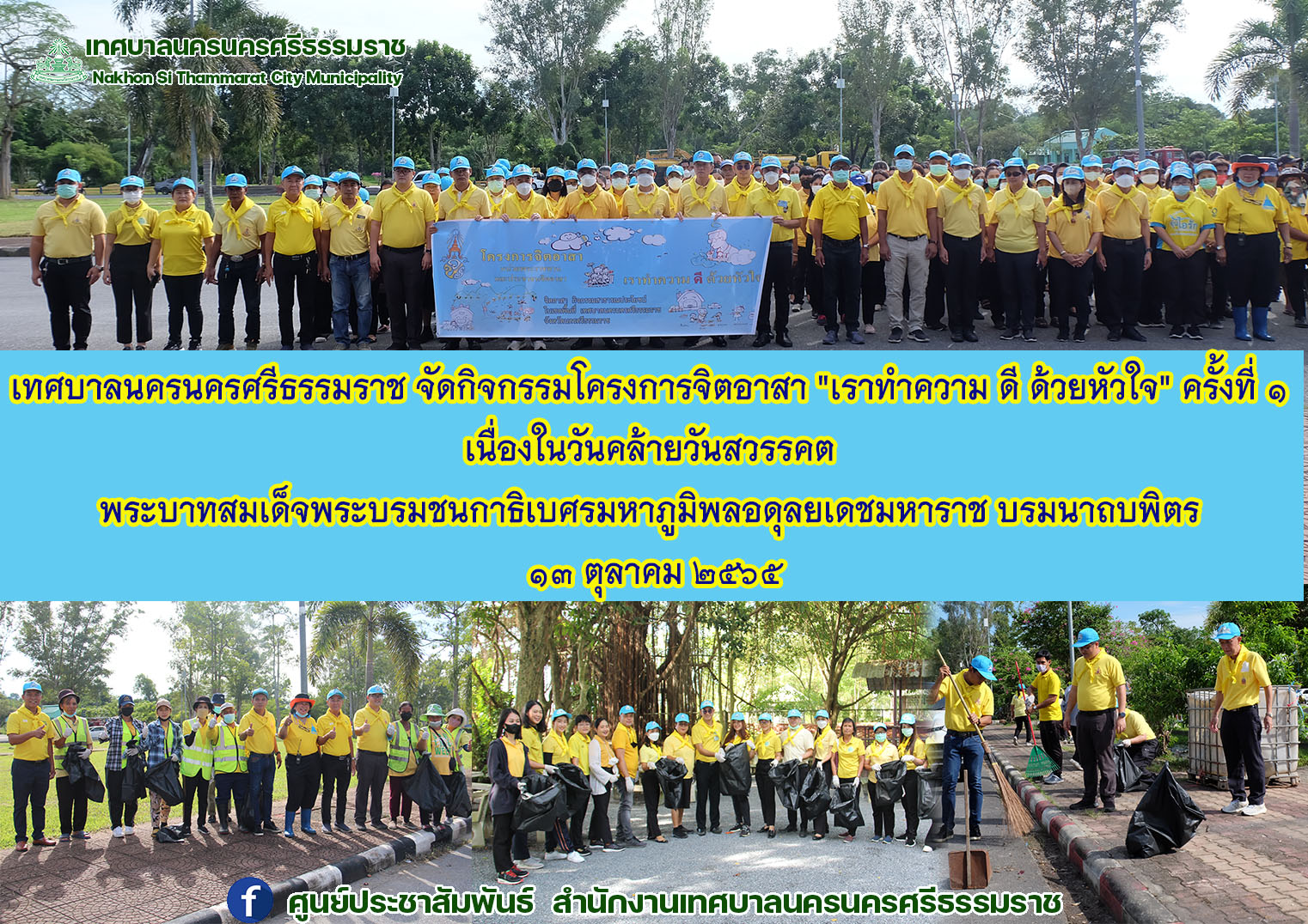 | เทศบาลนครนครศรีธรรมราช จัดกิจกรรมโครงการจิตอาสา "เราทำความ ดี ด้วยหัวใจ" ครั้งที่ 1 เนื่องในวันคล้ายวันสวรรคต พระบาทสมเด็จพระบรมชนกาธิเบศร มหาภูมิพลอดุลยเดชมหาราช บรมนาถบพิตร 13 ตุลาคม 2565 |