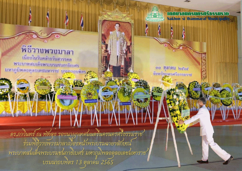 | วันพฤหัสบดีที่ 13 ตุลาคม พ.ศ.2565 เวลา 16.30 น. ณ หอประชุมเมือง สวนสาธารณะสวนสมเด็จพระศรีนครินทร์ '84 (ทุ่งท่าลาด) ดร.ภาวินทร์ ณ พัทลุง รองนายกเทศมนตรีนครนครศรีธรรมราช พร้อมด้วยคณะผู้บริหาร หัวหน้าส่วนราชการ ร่วมพิธีวางพวงมาลาเบื้องหน้าพระบรมฉายาลักษณ์ พระบาทสมเด็จพระบรมชนกาธิเบศร มหาภูมิพลอดุลยเดชมหาราช บรมนาถบพิตร |