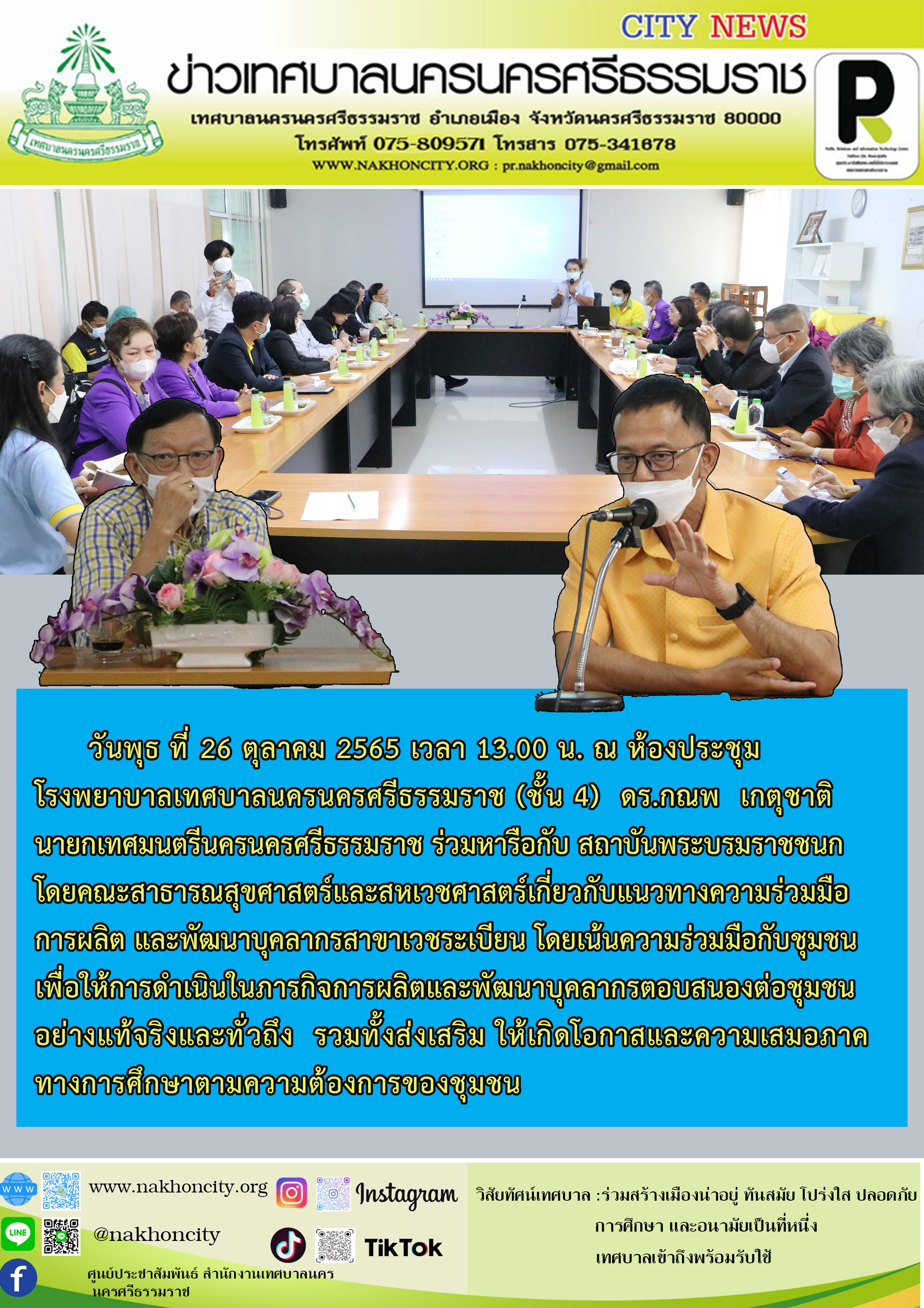 | วันพุธ ที่ 26 ตุลาคม 2565 เวลา 13.00 น. ณ ห้องประชุมโรงพยาบาลเทศบาลนครนครศรีธรรมราช (ชั้น 4) ดร.กณพ เกตุชาติ นายกเทศมนตรีนครนครศรีธรรมราช ร่วมหารือกับ สถาบันพระบรมราชชนก โดยคณะสาธารณสุขศาสตร์และสหเวชศาสตร์ เกี่ยวกับแนวทางความร่วมมือการผลิตและพัฒนาบุคลากรสาขาเวชระเบียน โดยเน้นความร่วมมือกับชุมชน เพื่อให้การดำเนินในภารกิจการผลิตและพัฒนาบุคลากรตอบสนองต่อชุมชนอย่างแท้จริงและทั่วถึงรวมทั้งส่งเสริมให้เกิดโอกาสและความเสมอภาคทางการศึกษาตามความต้องการของชุมชน
