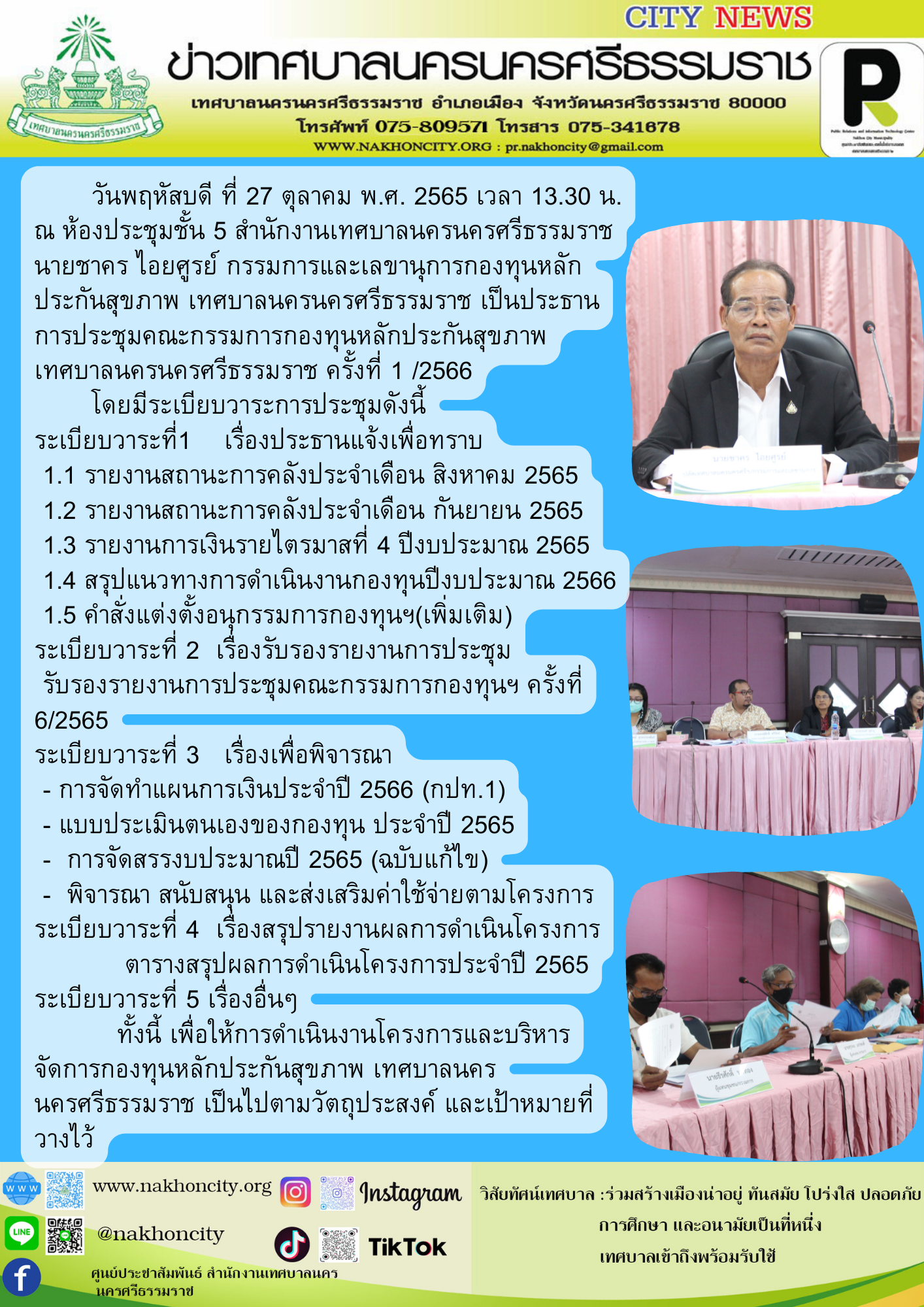 | วันพฤหัสบดี ที่ 27 ตุลาคม พ.ศ. 2565 เวลา 13.30 น. ณ ห้องประชุมชั้น 5 สำนักงานเทศบาลนครนครศรีธรรมราช นายชาคร ไอยศูรย์ กรรมการและเลขานุการกองทุนหลักประกันสุขภาพ เทศบาลนครนครศรีธรรมราช เป็นประธานการประชุมคณะกรรมการกองทุนหลักประกันสุขภาพ เทศบาลนครนครศรีธรรมราช ครั้งที่ 1 /2566 โดยมีระเบียบวาระการประชุมดังนี้ ระเบียบวาระที่1 เรื่องประธานแจ้งเพื่อทราบ 1.1 รายงานสถานะการคลังประจำเดือน สิงหาคม 2565 1.2 รายงานสถานะการคลังประจำเดือน กันยายน 2565 1.3 รายงานการเงินรายไตรมาสที่ 4 ปีงบประมาณ 2565 1.4 สรุปแนวทางการดำเนินงานกองทุนปีงบประมาณ 2566 1.5 คำสั่งแต่งตั้งอนุกรรมการกองทุนฯ(เพิ่มเติม) ระเบียบวาระที่ 2 เรื่องรับรองรายงานการประชุม รับรองรายงานการประชุมคณะกรรมการกองทุนฯ ครั้งที่ 6/2565 ระเบียบวาระที่ 3 เรื่องเพื่อพิจารณา - การจัดทำแผนการเงินประจำปี 2566 (กปท.1) - แบบประเมินตนเองของกองทุน ประจำปี 2565 - การจัดสรรงบประมาณปี 2565 (ฉบับแก้ไข) - พิจารณา สนับสนุน และส่งเสริมค่าใช้จ่ายตามโครงการ ระเบียบวาระที่ 4 เรื่องสรุปรายงานผลการดำเนินโครงการ ตารางสรุปผลการดำเนินโครงการประจำปี 2565 ระเบียบวาระที่ 5 เรื่องอื่นๆ ทั้งนี้ เพื่อให้การดำเนินงานโครงการและบริหารจัดการกองทุนหลักประกันสุขภาพ เทศบาลนครนครศรีธรรมราช เป็นไปตามวัตถุประสงค์ และเป้าหมายที่วางไว้
