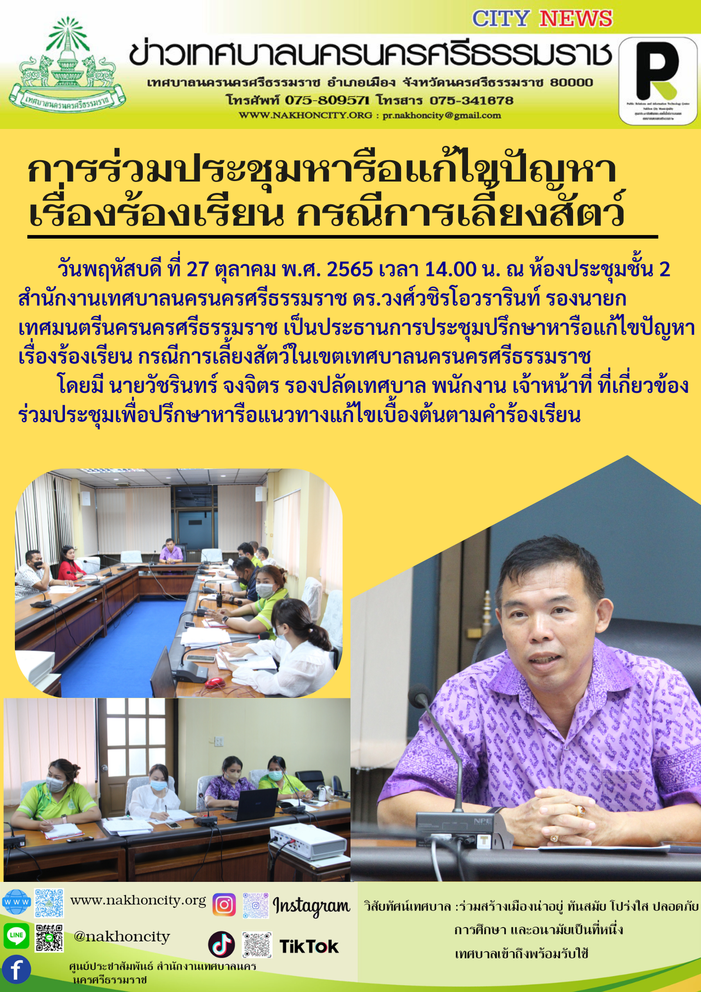 | วันพฤหัสบดีที่ 27 ตุลาคม พ.ศ. 2565 เวลา 14.00 น. ณ ห้องประชุมชั้น 2 สำนักงานเทศบาลนครนครศรีธรรมราช ดร.วงศ์วชิร โอวรารินท์ รองนายกเทศมนตรีนครนครศรีธรรมราช เป็นประธานการประชุมปรึกษาหารือแก้ไขปัญหาเรื่องร้องเรียนกรณีการเลี้ยงสัตว์ในเขตเทศบาลนครนครศรีธรรมราช โดยมี นายวัชรินทร์ จงจิตร รองปลัดเทศบาล พนักงาน เจ้าหน้าที่ ที่เกี่ยวข้อง ร่วมประชุมเพื่อปรึกษาหารือแนวทางแก้ไขเบื้องต้นตามคำร้องเรียน |