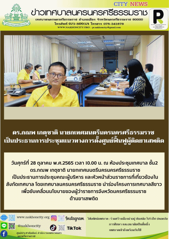 | ดร.กณพ เกตุชาติ นายกเทศมนตรีนครนครศรีธรรมราช เป็นประธานการประชุมแนวทางการตั้งศูนย์ฟื้นฟูผู้ติดยาเสพติด |