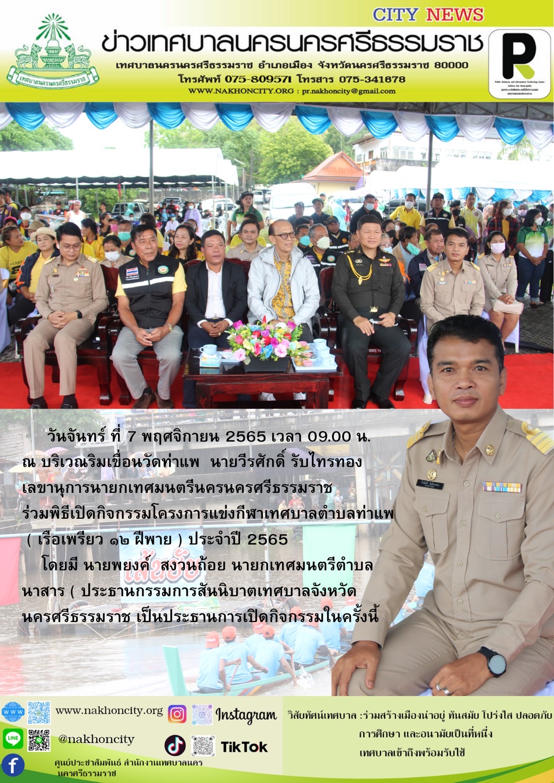 | นายวีระศักดิ์ รับไทรทอง เลขานุการนายกเทศมนตรีนครนครศรีธรรมราช ร่วมพิธีเปิดจกรรมโครงการแข่งกีฬาเทศบาลตำบลท่าแพ ( เรือเพรียว 12 ฝีพาย ) ประจำปี 2565 |