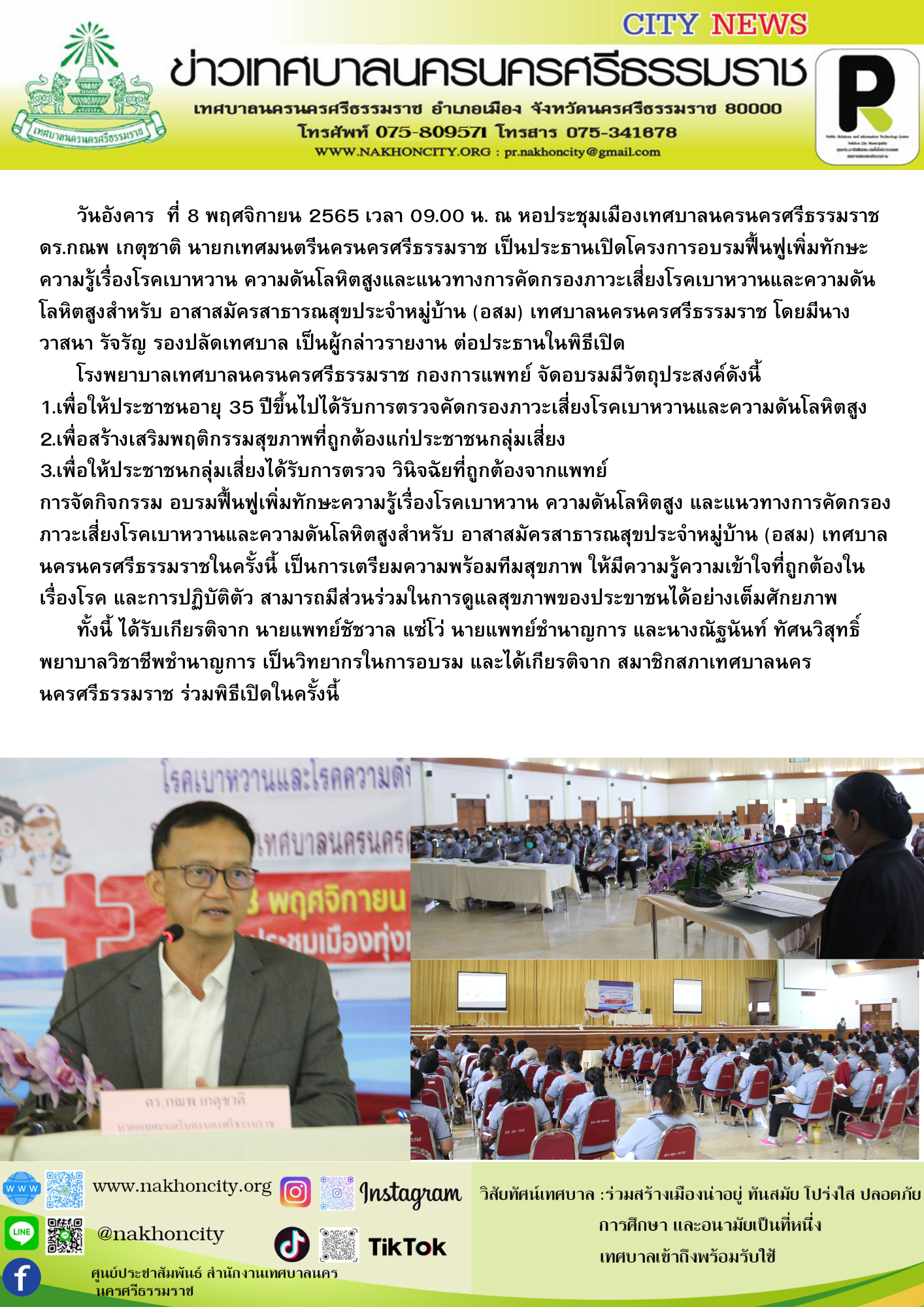 | ดร.กณพ เกตุชาติ นายกเทศมนตรีนครนครศรีธรรมราช เป็นประธานเปิดโครงการอบรมฟื้นฟูเพิ่มทักษะความรู้เรื่องโรคเบาหวาน ความดันโลหิตสูงและแนวทางการคัดกรองภาวะเสี่ยงโรคเบาหวานและความดันโลหิตสูงสำหรับ อาสาสมัครสาธารณสุขประจำหมู่บ้าน (อสม) เทศบาลนครนครศรีธรรมราช |