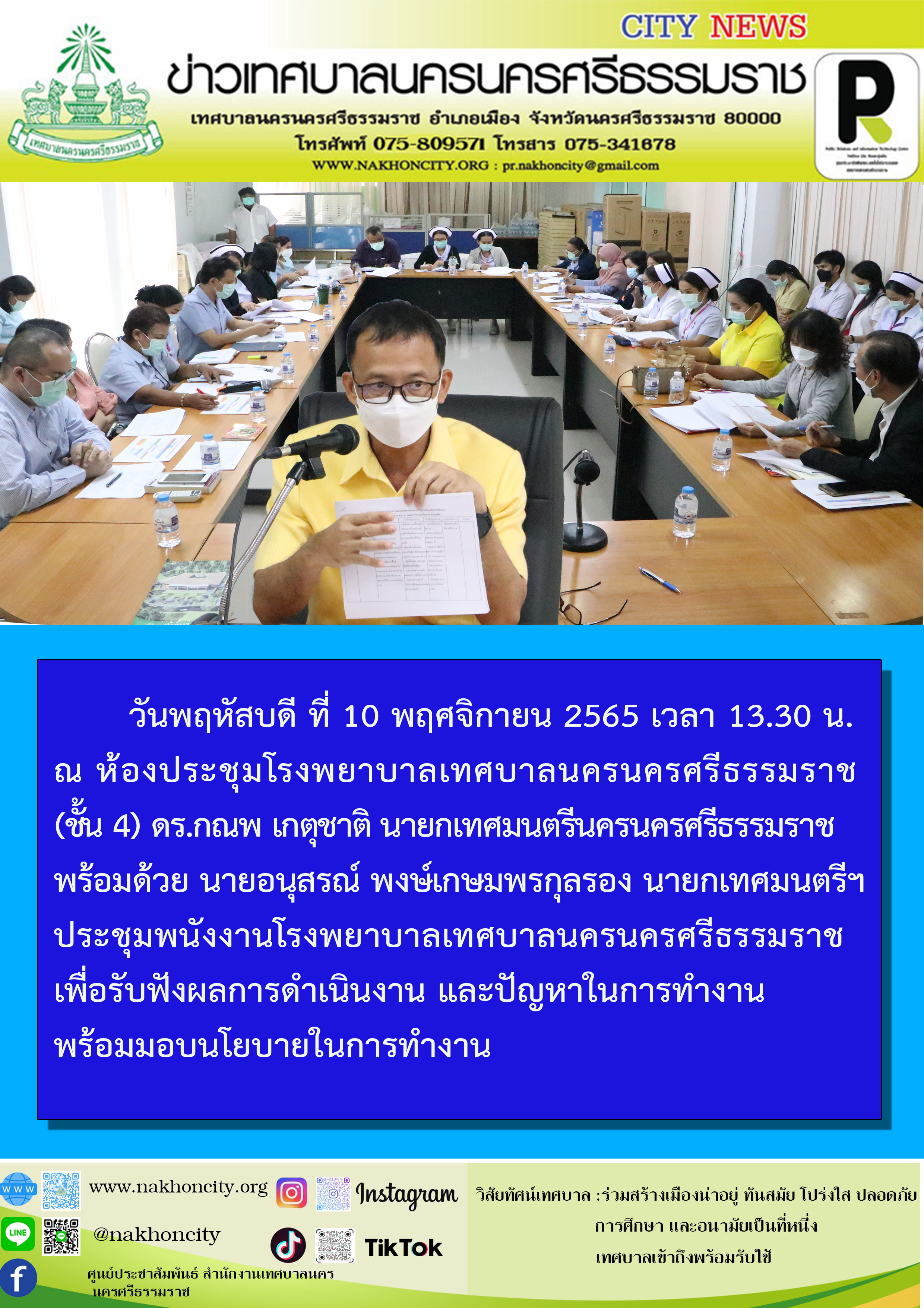 | วันพฤหัสบดี ที่ 10 พฤศจิกายน 2565 เวลา 13.30 น. ณ ห้องประชุมโรงพยาบาลเทศบาลนครนครศรีธรรมราช (ชั้น 4) ดร.กณพ เกตุชาติ นายกเทศมนตรีนครนครศรีธรรมราช พร้อมด้วย นายอนุสรณ์ พงษ์เกษมพรกุล รองนายกเทศมนตรีนครนครศรีธรรมราช ประชุมพนังงานโรงพยาบาลเทศบาลนครนครศรีธรรมราช เพื่อรับฟังผลการดำเนินงาน และปัญหาในการทำงาน พร้อมมอบนโยบายในการทำงาน